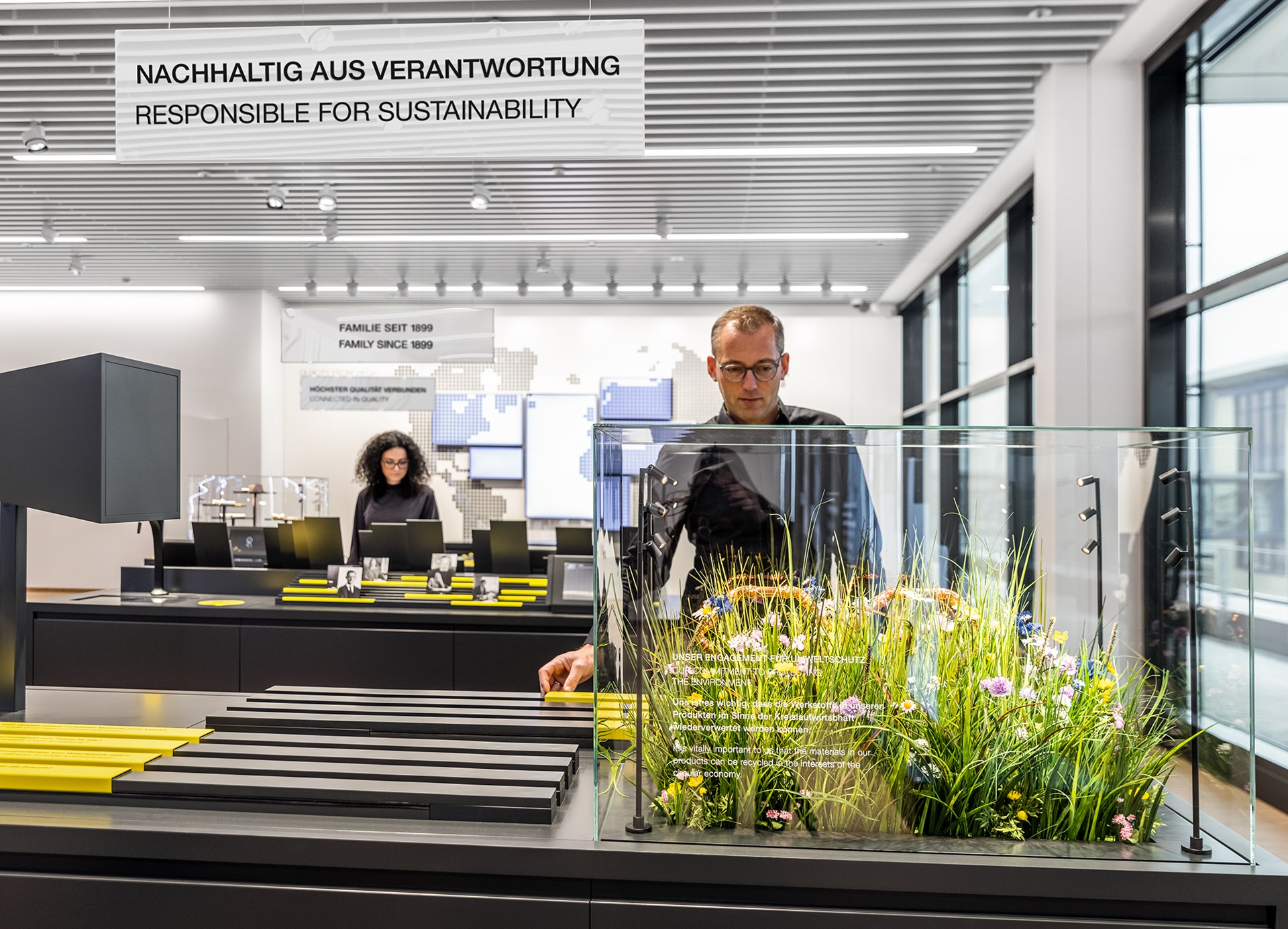 Viega heeft de ambitie om ook op vlak van duurzaamheid en klimaatbescherming een pionier te zijn, en dat blijkt ook in Viega World. Het gebouw is volledig klimaatneutraal en wordt van energie voorzien door een PV-installatie van maar liefst 2.700 m2, met een jaarlijkse opbrengst tot 210.000 kWh. De piekopbrengsten daarvan worden niet aan het openbare stroomnet geleverd, maar dankzij warmtepompen efficiënter omgezet in warmte of koude en voor betonactivering gebruikt. Bovendien wordt ook de restwarmte van de naburige productiehal ingezet in de verwarming van het gebouw. Op die manier draagt Viega World ook bij aan het doel van Viega om tegen 2035 zelf volledig CO2-neutraal te zijn.