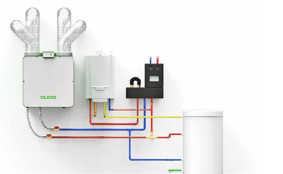 Op koude dagen zal de DucoBox Eco alleen niet volstaan. Dat lost de fabrikant op met twee concepten: de all-electric en de hybride-opstelling. De all-electric volstaat voor woningen met een lage warmtevraag (5 kW), voor woningen met een hogere warmtevraag kan men de DucoBox Eco bijvoorbeeld koppelen aan een gasketel. Daarmee kan tot 60 procent op het gasverbruik worden bespaard. Daarenboven is het systeem flexibel. Wil je in de toekomst af van de gasketel, dan kan je eenvoudig overschakelen op de elektrische variant, idealiter in combinatie met fotovoltaïsche zonnepanelen.
