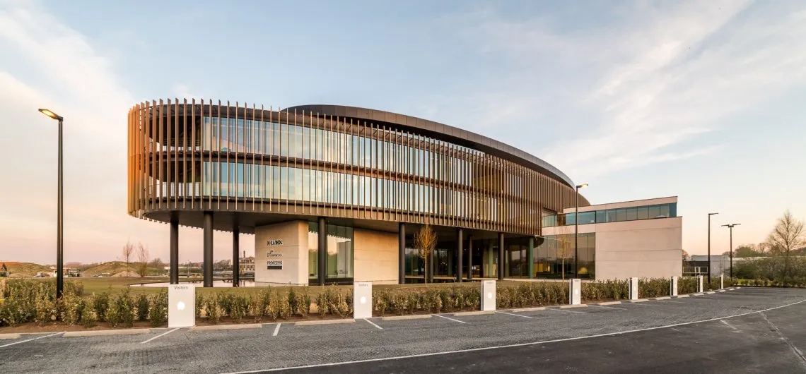 In Ieper ontwierp AAVO Architects een nieuw hoofdkantoor voor de Picanol Group, een internationaal actief industrieel concern. Het gebouw heeft een opvallende elliptische vorm, geïnspireerd op de weefspoel, en ligt als een gouden kroon aan de rand van het bedrijfsterrein. De vorm en de 360°-oriëntatie zorgen voor een sterke relatie met het omringende landschap en doorbreken de traditionele orthogonale kantoorgeometrie. Binnen biedt het gebouw plaats aan 472 werkplekken, trainingsruimtes, een auditorium voor 250 personen en een restaurant voor 500 bezoekers.
