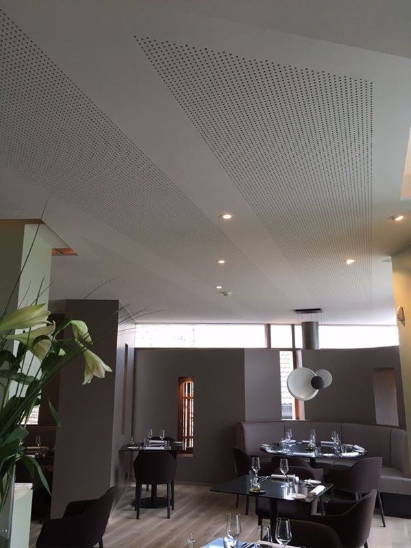 De plafonds van het restaurant zijn uitgevoerd met Rigitone SF 8/18 R-platen om zowel een visuele dynamiek als een uitstekende akoestiek te creëren. De buitenmuren zijn op hun beurt uitgerust met Habito-platen, die zich uitstekend lenen tot de (eenvoudige) verankering van decoratie-elementen en meteen ook het omgevingsgeluid reduceren. De binnenmuren zijn – eveneens vanuit akoestisch oogpunt – afgewerkt met Soundblock-platen. De vele lichtsleuven zijn op esthetische wijze vormgegeven met Gypforme A. De houtskeletmuren van de uitbreiding zijn bekleed met Rigidur H-platen, die zwaar materiaal kunnen dragen. En de vloer van de gastenkamers is opgebouwd uit Rigidur Floor-panelen, die het mogelijk maakten om de plankenvloer in ere te herstellen zonder enig gebruik van water.