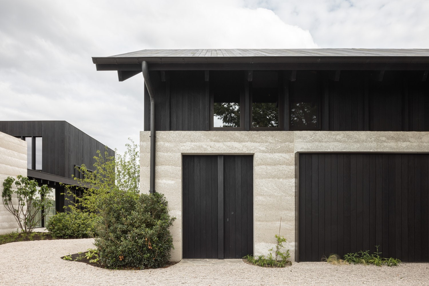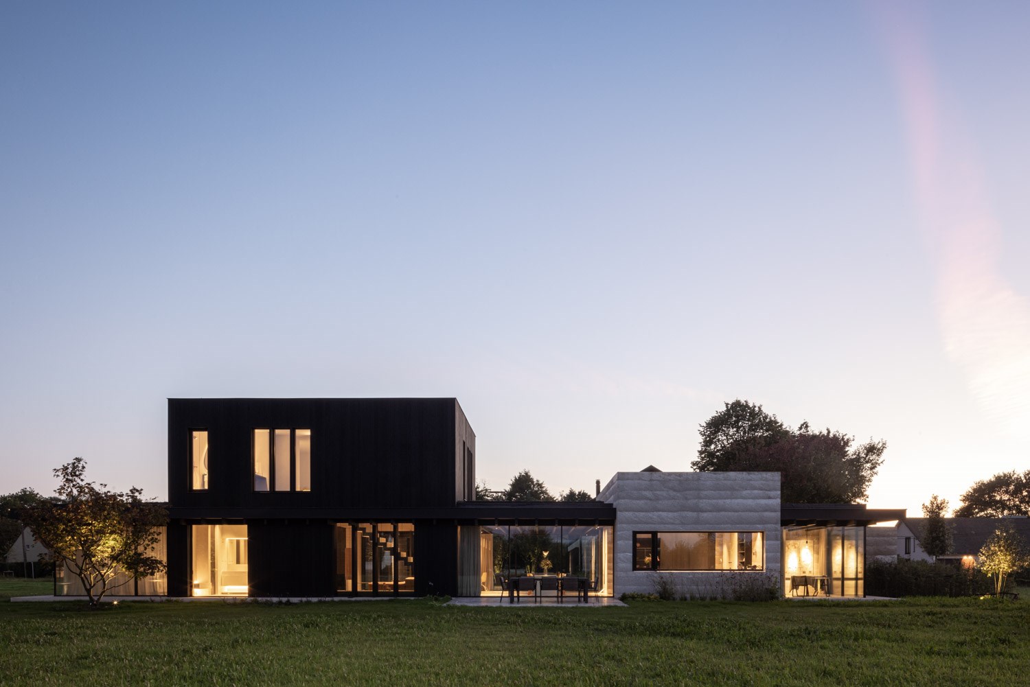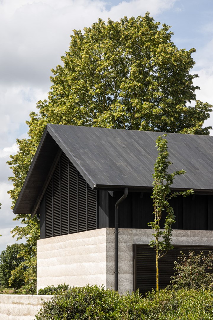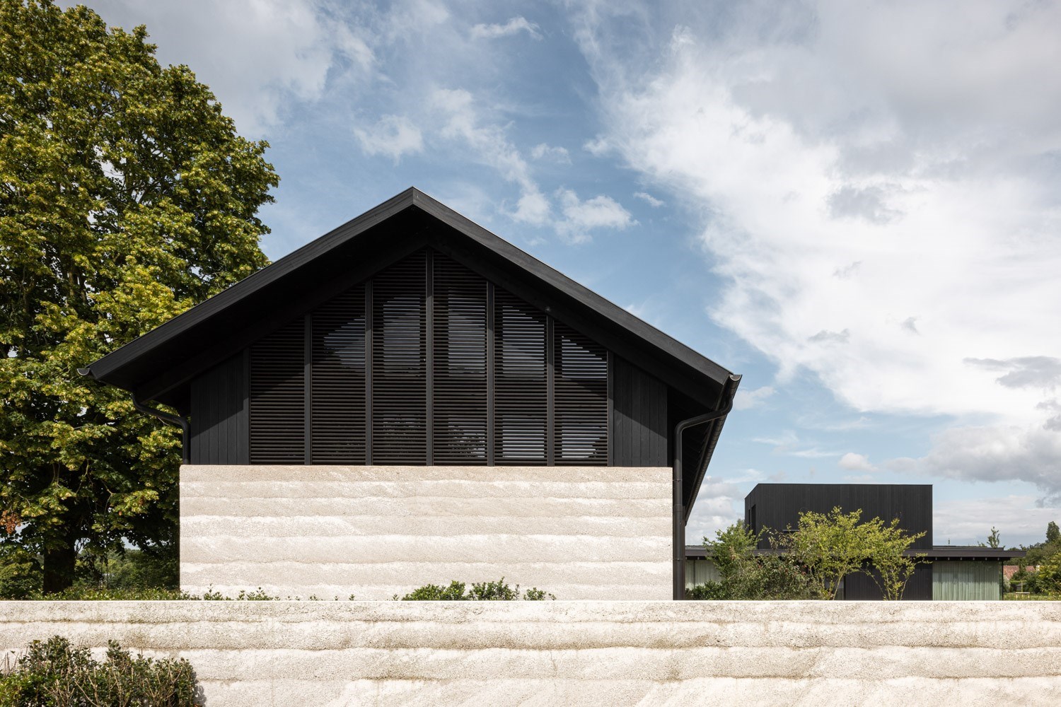 Vanop de weg valt vooreerst het volume op dat zich haaks op de weg positioneert. Het gebouw presenteert zich als een retake van de klassieke schuurtypologie; voorts eenvoudig van vorm en een herberg voor alle niet-woonfuncties en technieken. Zo wordt het woongedeelte van dode oppervlakte bevrijd en sluiten alle woonruimten direct op elkaar aan. Samen met hout en glas vormt stampbeton het trio materialen dat voor beide gebouwen werd gebruikt. Het stampbeton werd in lagen van verschillende hoogtes gegoten, het hout werd donker geolied en het glas zit vervat in ultraslanke aluminiumprofielen.