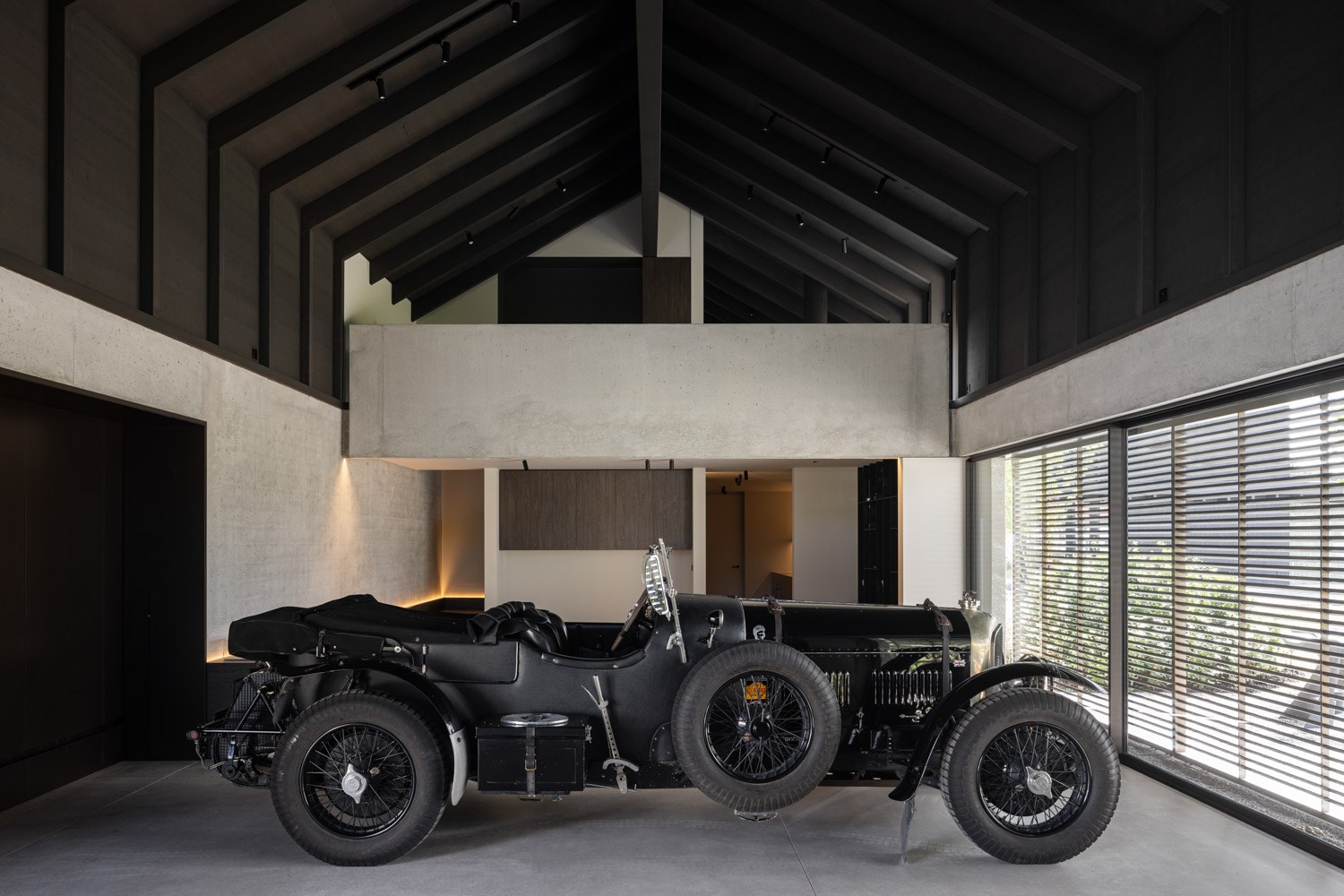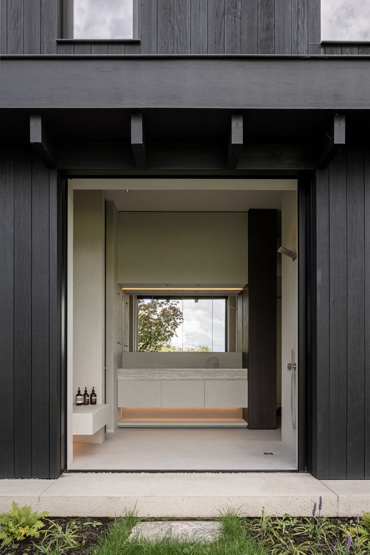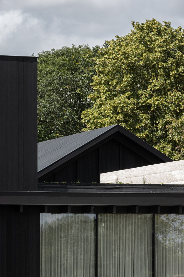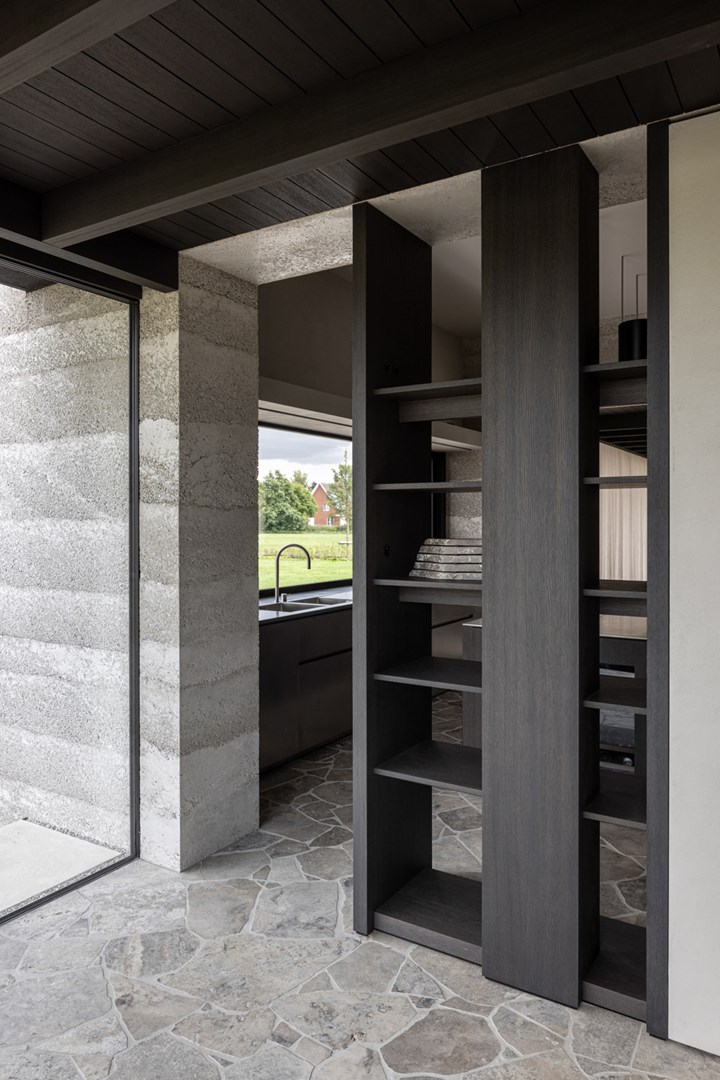 Vanop de weg valt vooreerst het volume op dat zich haaks op de weg positioneert. Het gebouw presenteert zich als een retake van de klassieke schuurtypologie; voorts eenvoudig van vorm en een herberg voor alle niet-woonfuncties en technieken. Zo wordt het woongedeelte van dode oppervlakte bevrijd en sluiten alle woonruimten direct op elkaar aan. Samen met hout en glas vormt stampbeton het trio materialen dat voor beide gebouwen werd gebruikt. Het stampbeton werd in lagen van verschillende hoogtes gegoten, het hout werd donker geolied en het glas zit vervat in ultraslanke aluminiumprofielen.