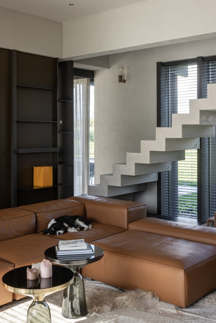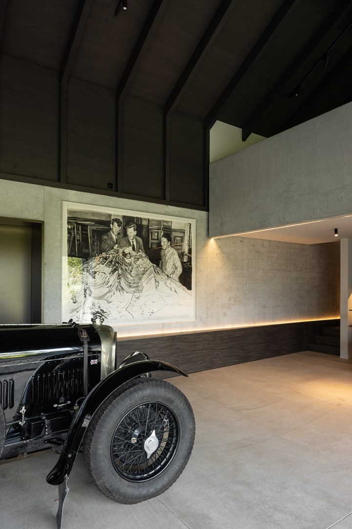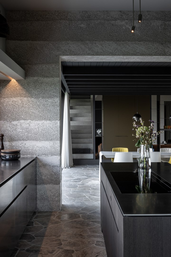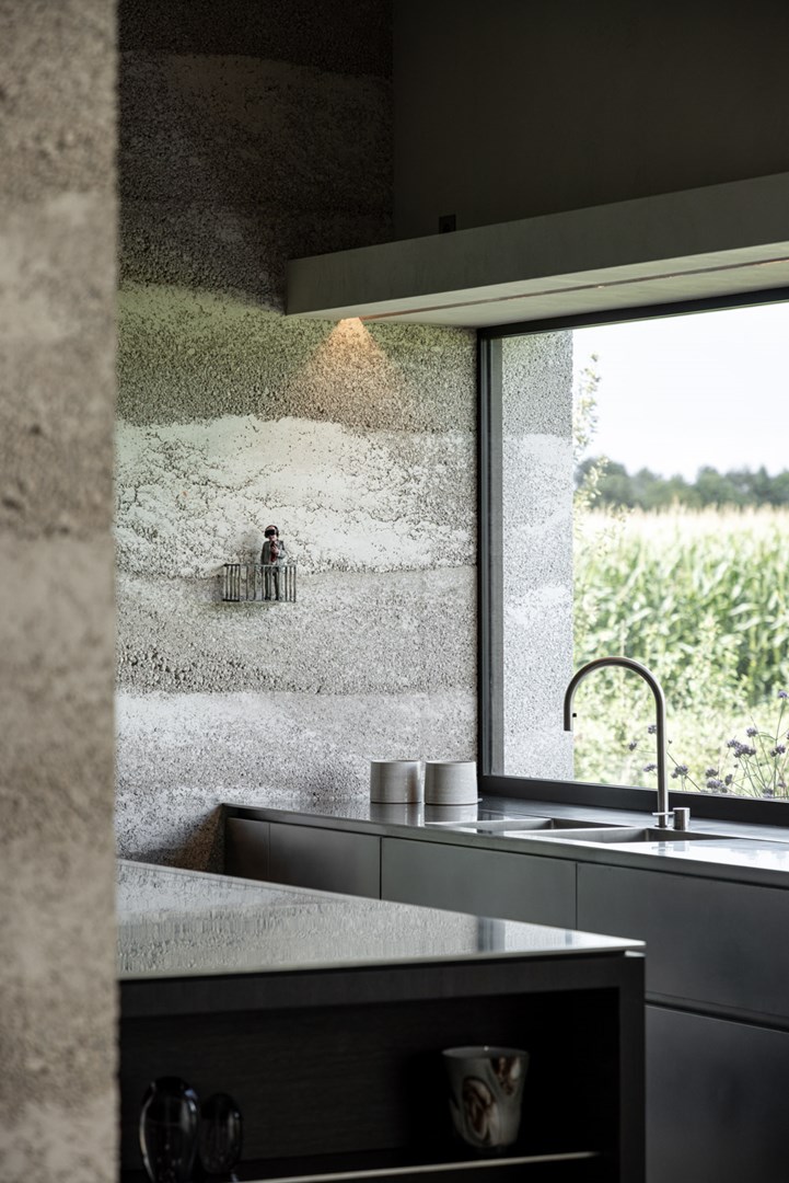Unieke features in dit geheel zijn de gelijkvloerse badkamer waar het venster volledig kan openschuiven zodat douchen een binnen-buitenervaring wordt en het uitzicht vanuit de keuken dat als een uitgesneden canvas zuurstof geeft. Via de sculpturale betonnen trap ga je naar de verdieping met slaapvertrekken die de volwassenen kinderen uitnodigen tot een meerdaags bezoek. Reken ook nog een dynamisch spel tussen hoge en verlaagde plafonds en je krijgt een cocooneske, warme bolster binnen de betonnen schil van deze unieke nieuwbouwwoning.