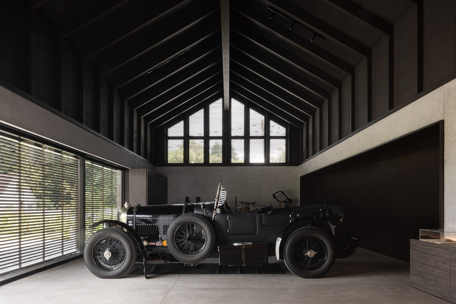 Parallel met de baan ligt het woongedeelte. Zonder hellend dak en gestript van alle aankleding toont dit volume zich in essentie als een conceptuele opeenvolging van gesloten ruimtes met open, glazen volumes ertussenin. Van aan de ingang loop je zo door een centrale gang die de keuken links en de netjes weggewerkte, praktische ruimtes rechts van elkaar scheidt om uit te monden in een opeenvolging van een open leefruimte, intieme zitruimte en de masterbedroom. Ook die laatste weet, warmpjes aangekleed met textiel, een laag balkenplafond in donkere eik en omzoomd door landschap, de balans te vinden tussen weids en geborgen wonen.