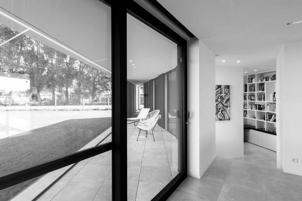 Het echte leven speelt zich af in de woonkeuken en het gemeenschappelijke bureau, op het knooppunt waar de twee lange delen samen komen. Elke individuele ruimte heeft leuke en verrassende perspectieven. De indeling is een spel van open en gesloten delen, zonder banale gangen en met gemeenschappelijke witte kasten in de circulatiezones.