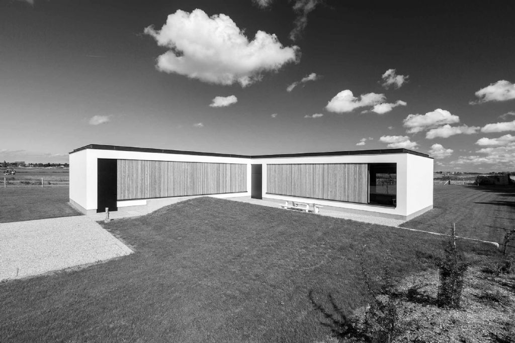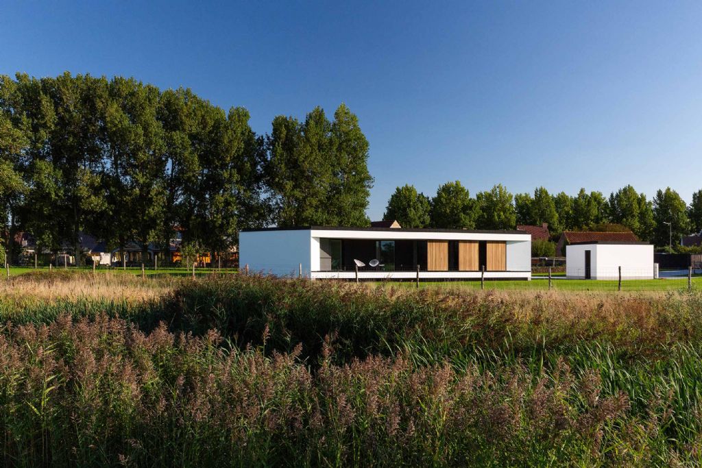 Villa Y staat in de buurt van de kerk van een typisch Vlaams polderdorp en aan de rand van een golfterrein in Wulpen. De eigenaar vroeg Desmet & Lammens architecten om een compacte en open, passieve woning voor een groot gezin, afgeschermd tegen inkijk van buitenaf.