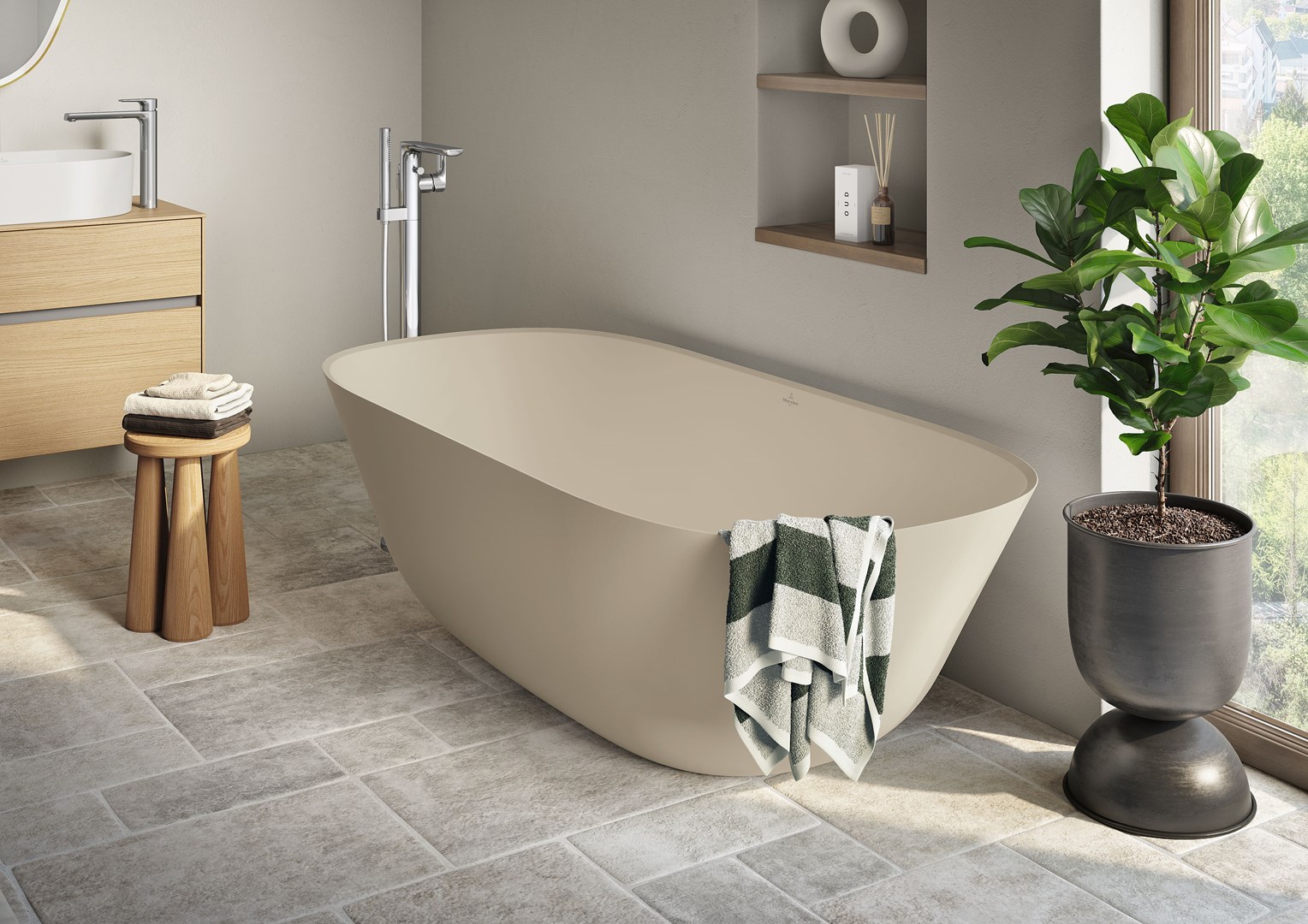 Voor de nieuwe kleuren liet Villeroy & Boch zich inspireren door de natuur. Natuurlijke kleuren creëren een ontspannen sfeer in de badkamer. De nieuwe kleuren beige Almond en het grijsgroene Morning Green combineren prachtig met natuurlijke materialen zoals hout, steen en met aardse kleuren. De beige tint Almond geeft elke badkamer op subtiele wijze een opvallend karakter. De elegante kleur zorgt voor een warme, zachte sfeer en een lichte basis. Morning Green is een frisse, sfeervolle kleur en straalt kalmte en rust uit. Tegelijkertijd is Moring Green karakteristiek en maakt het van een standaard badkamer een stijlvolle ruimte.