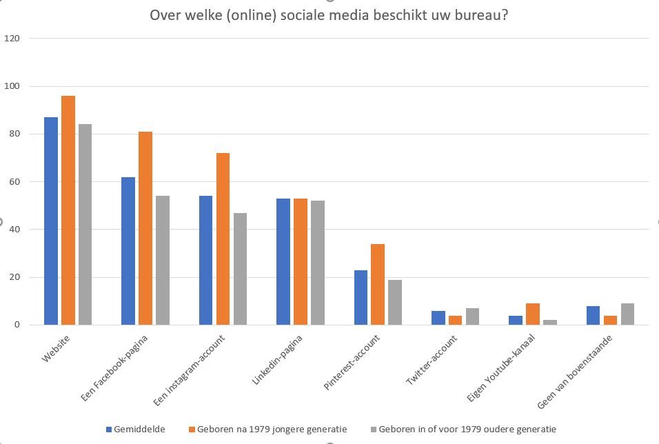 We noteren met betrekking tot het gebruik van social media niet alleen aanzienlijke verschillen qua leeftijd, maar zeker ook qua grootte van het bureau. Eenmansbedrijven zijn veel minder actief op social media dan de grotere bureaus. Van de eenmansbureaus heeft slechts 66% een eigen website, 45% een Facebook-pagina, 25% een Instagram-account en 36% een LinkedIn-Pagina. Een grote kloof met de grotere bureaus: 94% een eigen website, 67% een Facebook-pagina, 64% een Instagram-account en 58% een LinkedIn-pagina. De kloof is dus veruit het grootst bij Instagram (25 versus 64%)