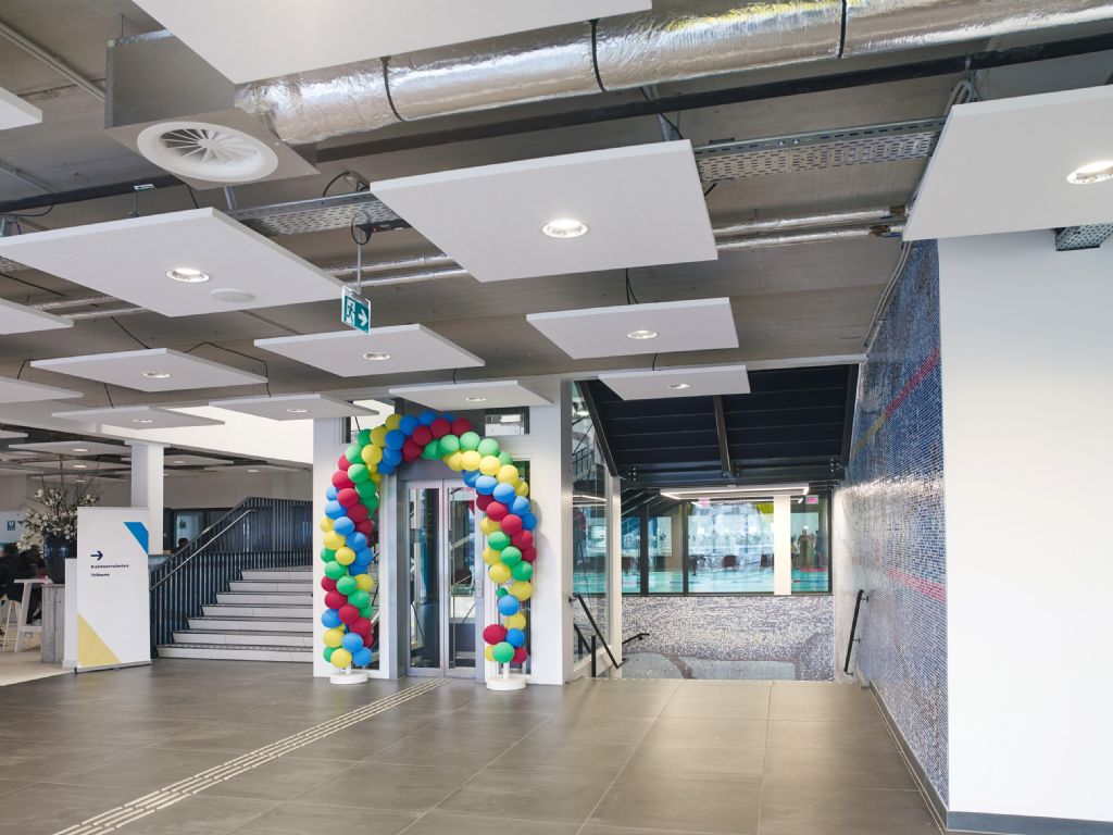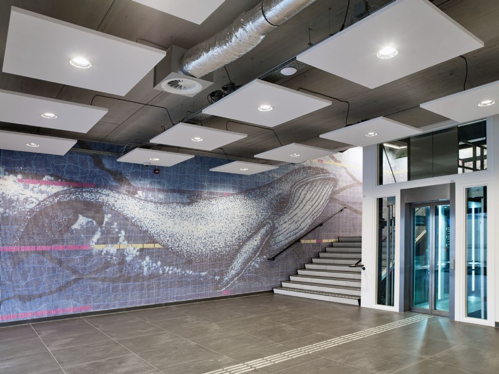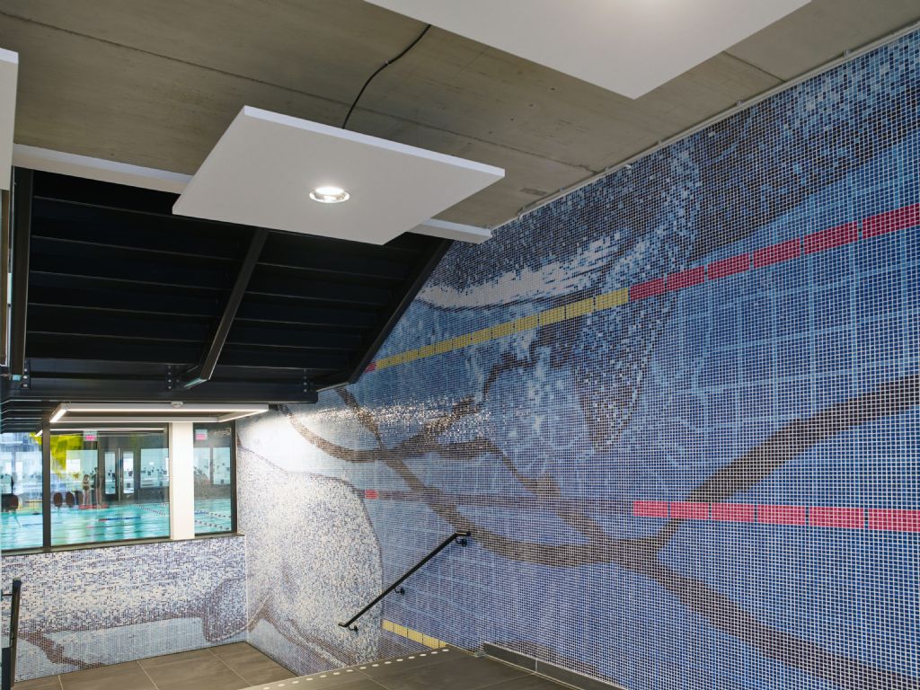 De galm in de trappenhuizen en diverse multifunctionele zalen wordt beteugeld met behulp van Sinfonia panelen (αw = 0,85) in een verdekt systeem. En tot slot voorzien de Brillianto A95 panelen(αw = 0,95) de open kantoorruimtes van uitstekende akoestiek. Zo genieten bezoekers en werknemers door het gehele zwemcentrum van een prettig geluidsniveau.