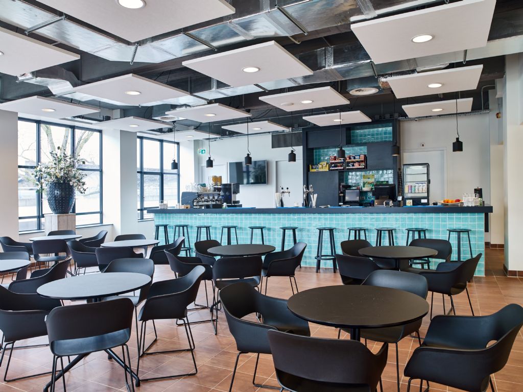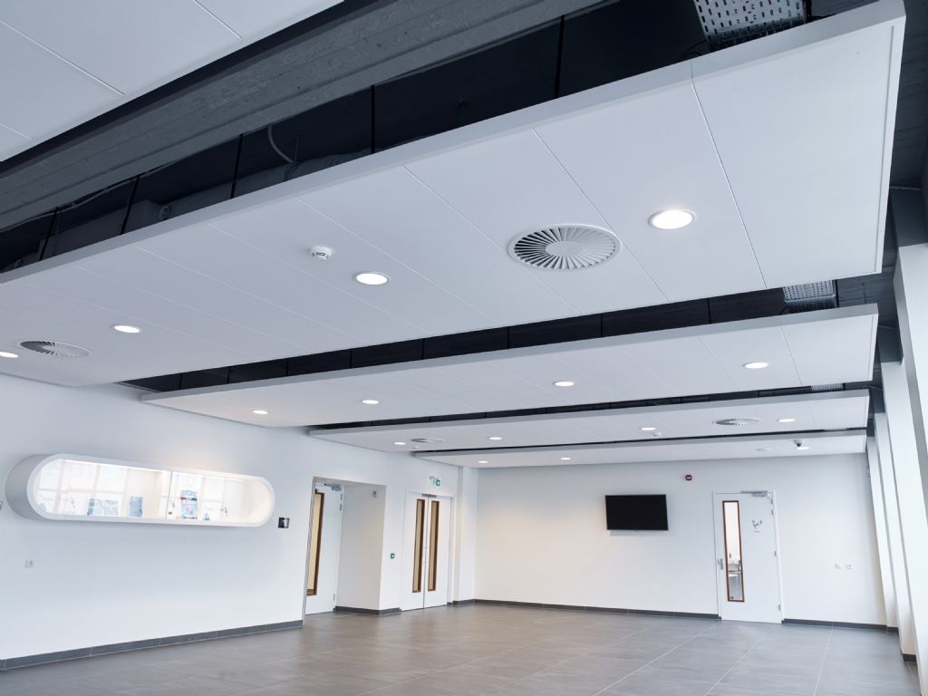 Naast een feilloze vochtbestendigheid van de plafonds werd ook een grote bijdrage in geluidsbeheersing door het gehele pand geëist. Hiertoe verzorgde OWA diverse plafondoplossingen op maat. Zo verzorgen de Ocean panelen met een A-klasse absorptiewaarde (αw = 0,95) een flinke geluidsreductie in de natte ruimtes van het zwemcentrum. De entreehal en kantine worden met behulp van het plafondeiland Selecta (αw = 1,00) voorzien van een aangenaam akoestisch klimaat én moderne uitstraling.