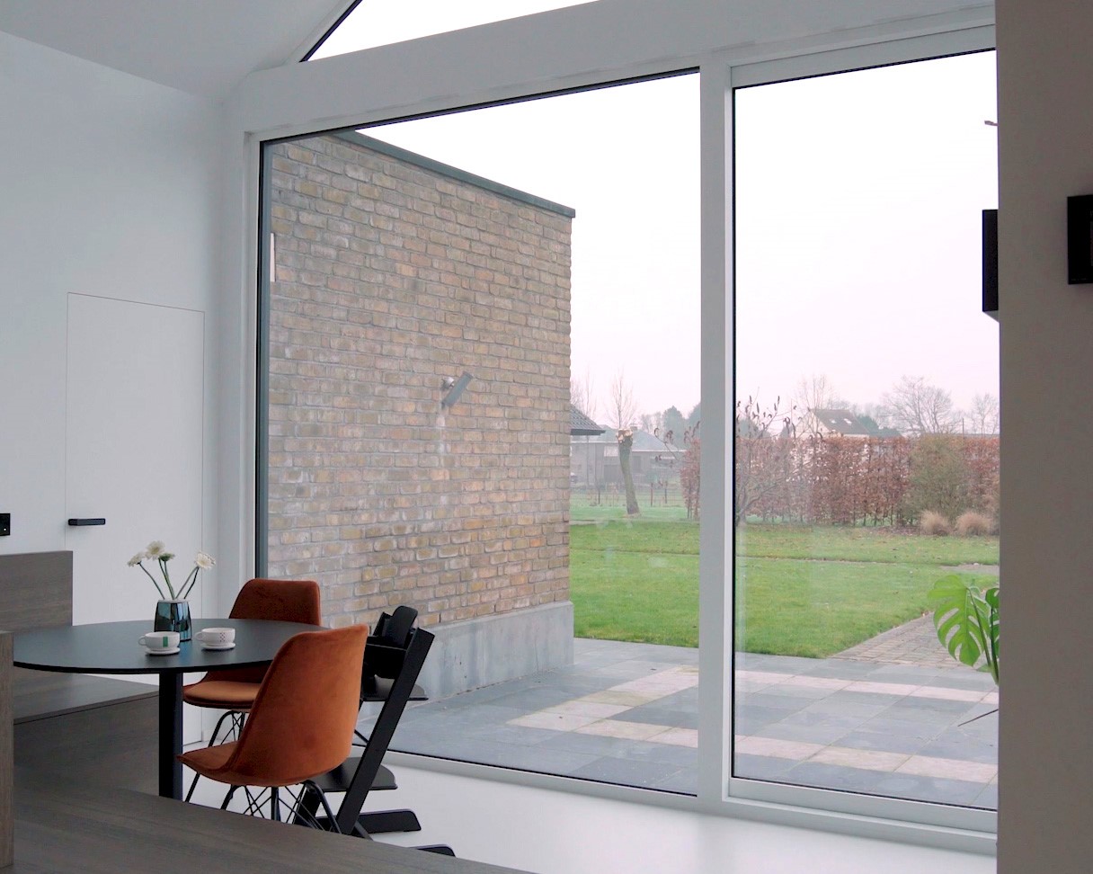 Ook de eetkamer kreeg een facelift. Het grote en hoge raam zorgt voor heel wat lichtinval. Door het gebruik van Xinnix-frames wordt dit lichtrijke gevoel enkel maar versterkt. Dit resulteert in een uitnodigende kamer om samen te tafelen met bezoekers.