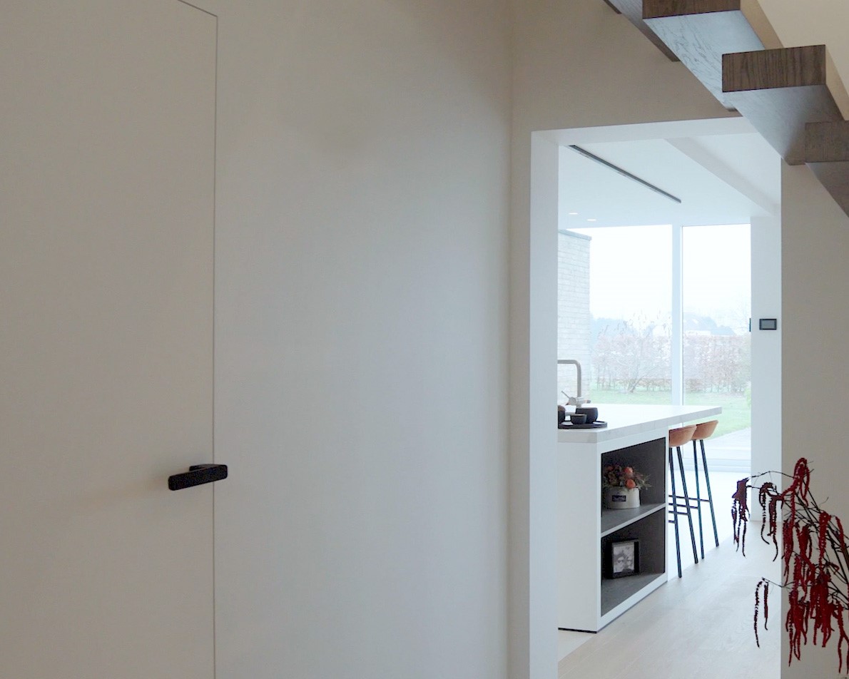 Door de donkere houten deuren te vervangen door Xinnix-deuren, licht de hall meteen op. Je krijgt een echt ruimtegevoel door de witte kleur en afwezigheid van omlijstingen. Het zwarte accent van de deurkrukken zorgt voor de finishing touch.