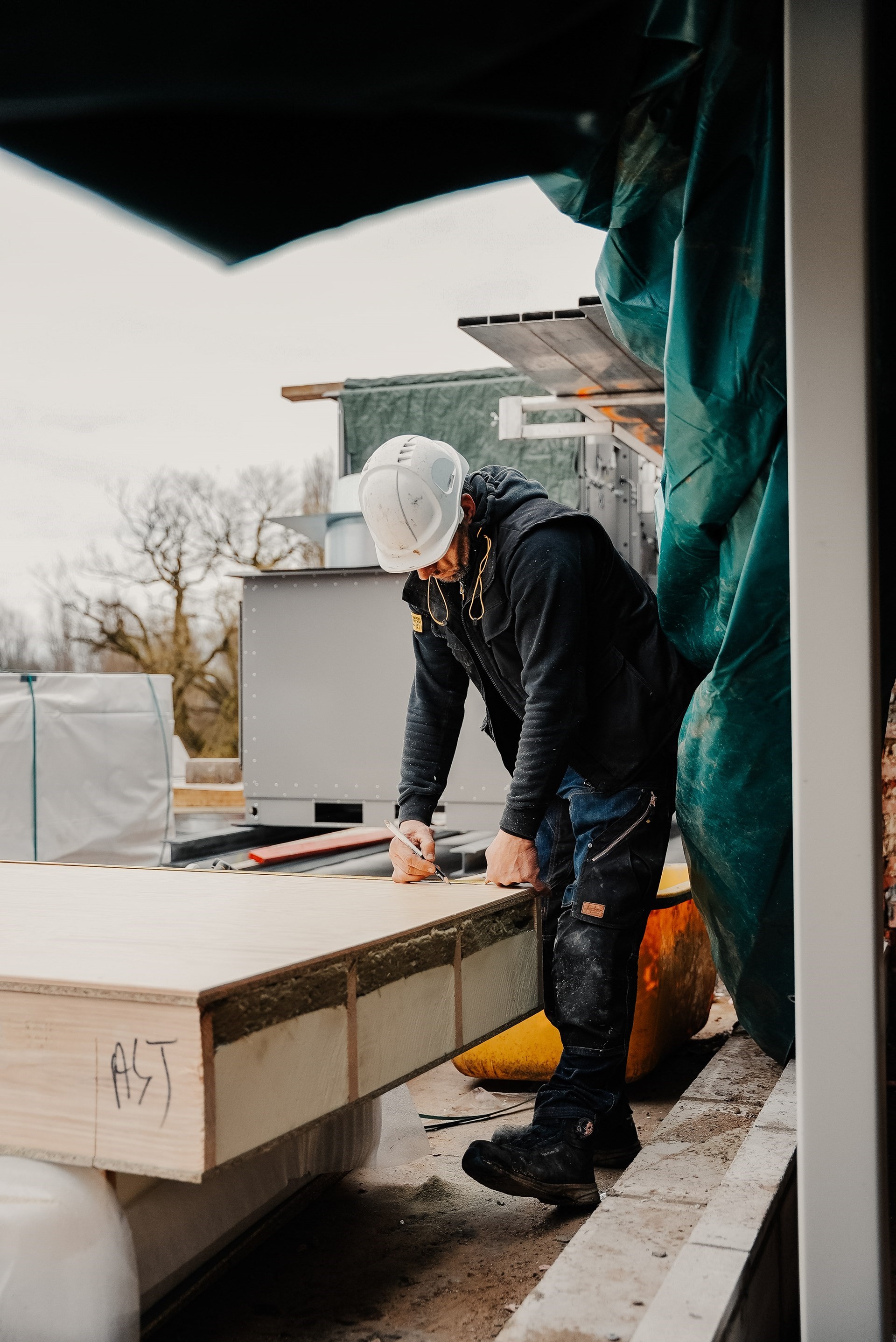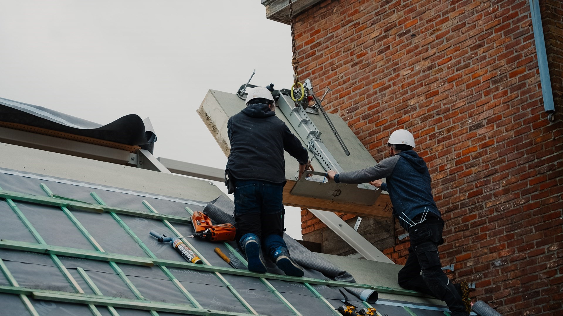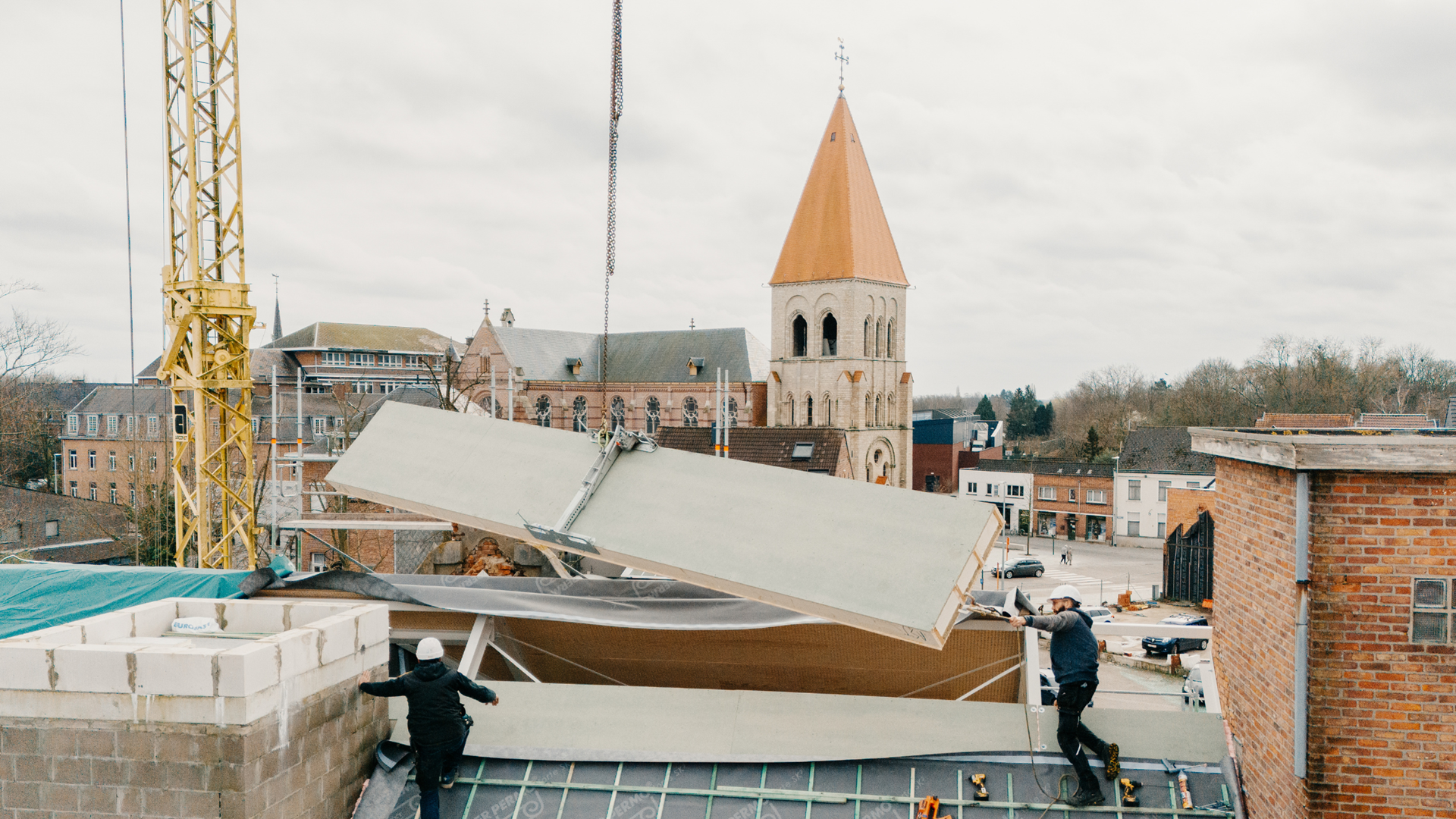 Een kwalitatief legplan bewijst zijn meerwaarde absoluut op de werf. De aannemer kan heel vlot aan de slag om het dak correct te plaatsen. In totaal worden 434,18 m² dakelementen in sneltempo geïnstalleerd. “We werken met één kraanman die de dakpanelen aanhaakt en naar boven trekt. Een dakwerker plaatst ze en schroeft ze vast,” zegt projectleider Bart Oury.