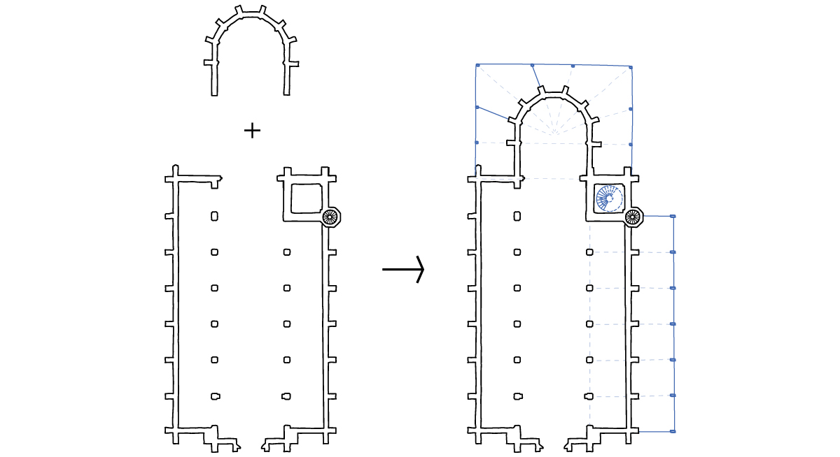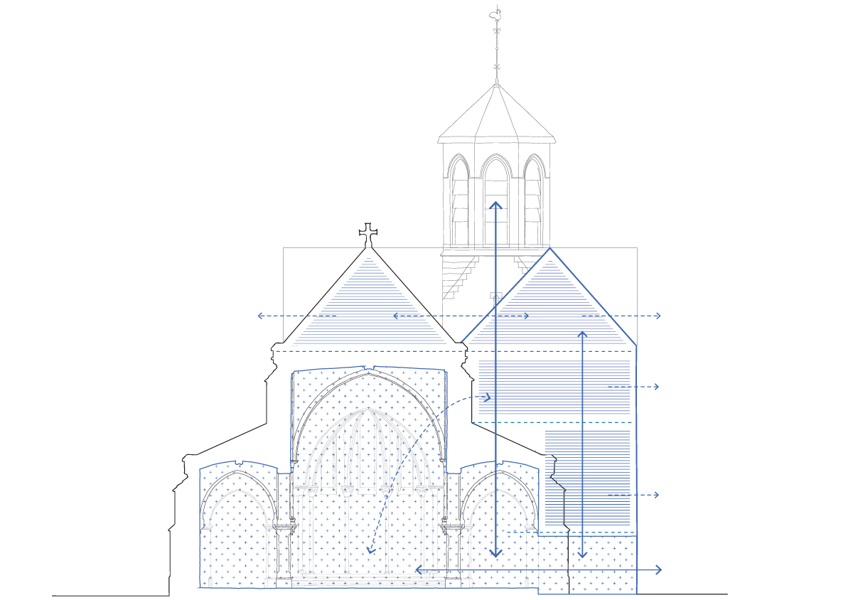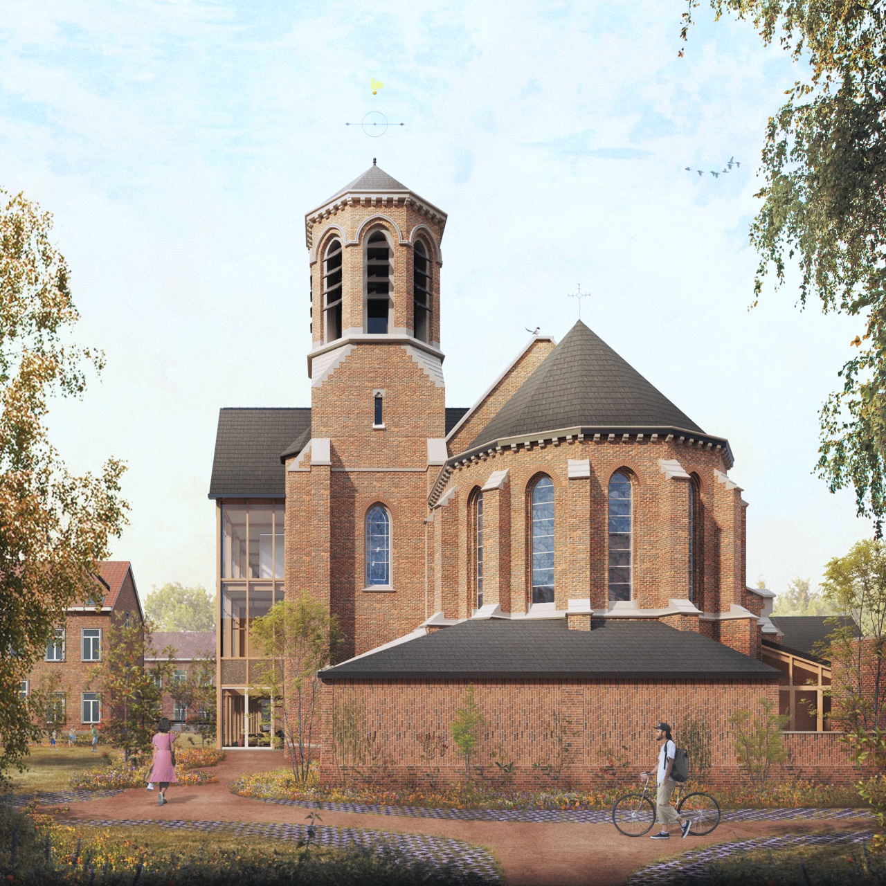 Het kerkschip is een indrukwekkende ruimte die vormgegeven werd om een grote groep mensen in volle verwondering een plek te kunnen geven. Het is dan ook vanzelfsprekend dat deze monumentale ruimtelijkheid wordt behouden en versterkt in de nieuwe functie voor de kerk. Het koor, met haar halfronde vorm en prachtige glasramen, is een zeer bijzondere plek in de kerk en barst van de symboliek. Deze meer intieme plek zal ook in dit nieuw hoofdstuk fungeren als het hart van de dagelijkse werking. In het knooppunt tussen beide delen bevindt zich de toren, als baken en aankondiging van de kerk in de wijde context.