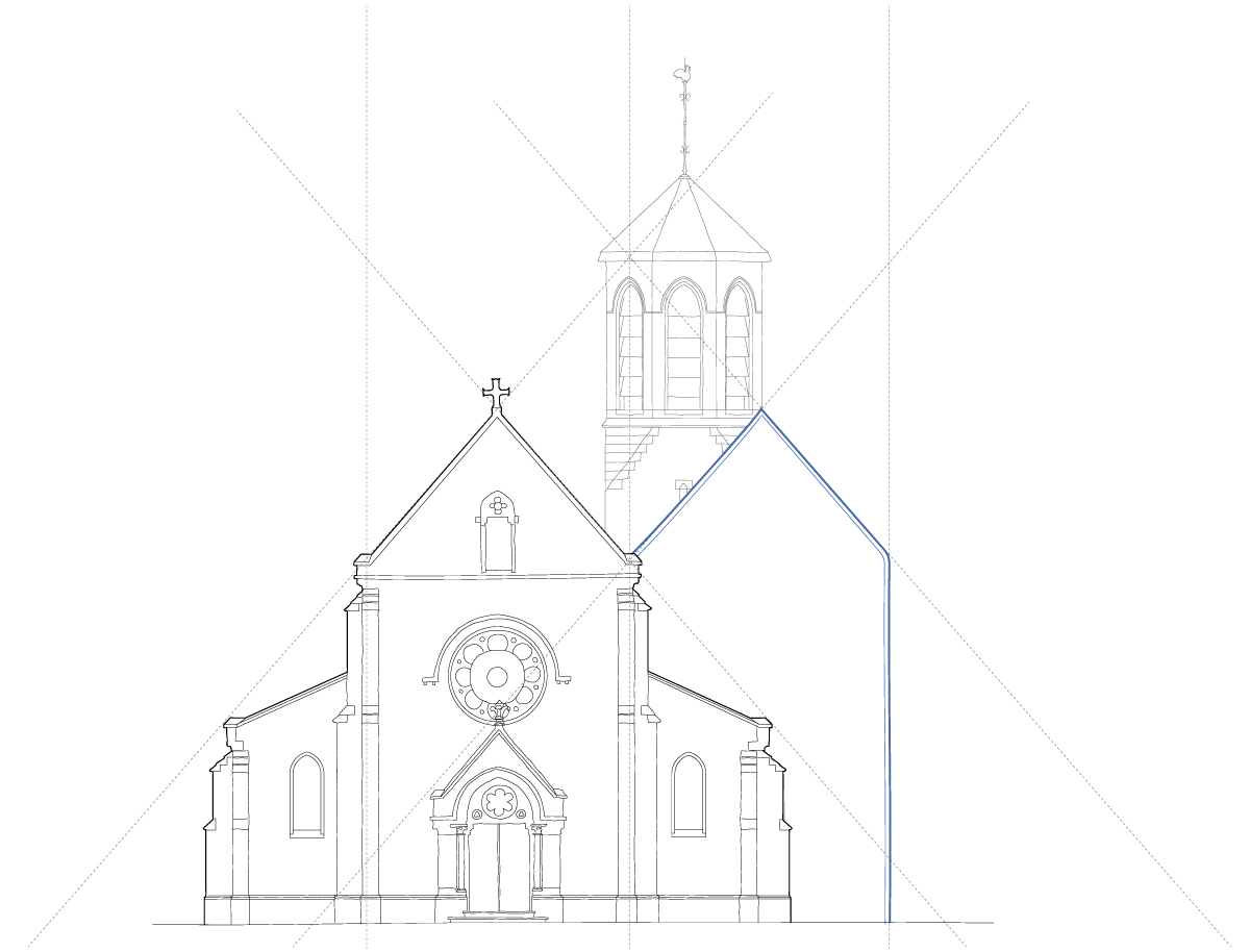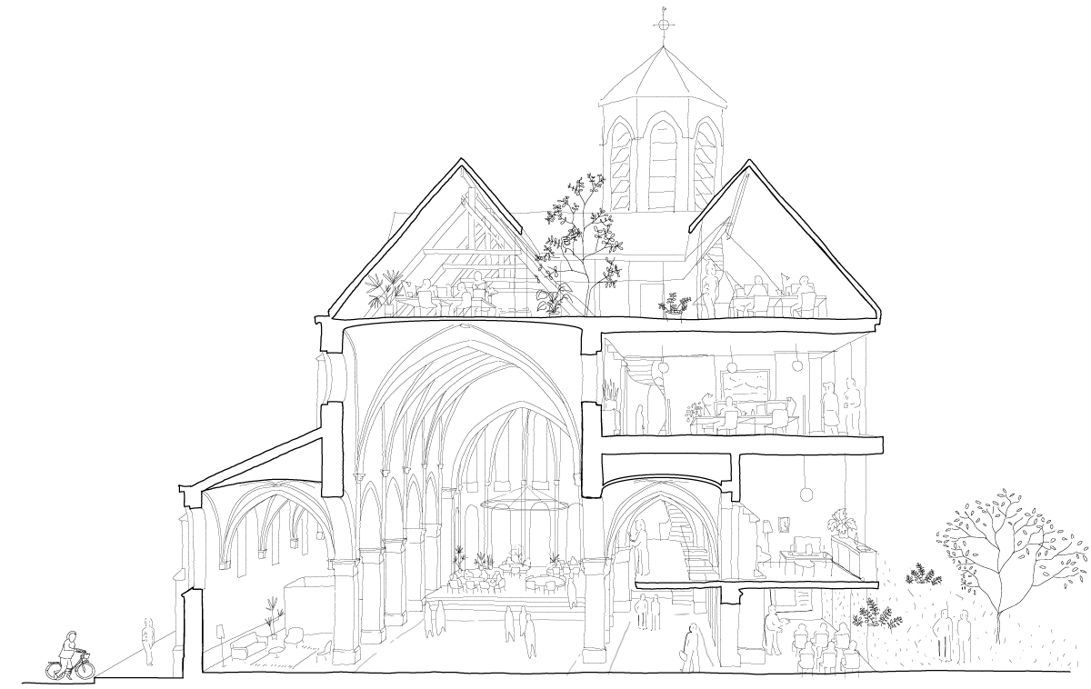 Het nieuwe volume voelt vertrouwd aan, want het kent een gelijkaardige vormelijke expressie en heeft dezelfde verhoudingen als de middenbeuk van de kerk, en vult de voorgevel op poëtische wijze aan, waarbij een meerlaagse en diepere lezing van het kerkgebouw wordt gegenereerd. Het volledige kerkschip, inclusief de zijbeuken, blijft zo behouden als open, flexibele, en multifunctionele ruimte, terwijl in het dakvolume een inspirerend landschap ontstaat van flexibele werkplekken.