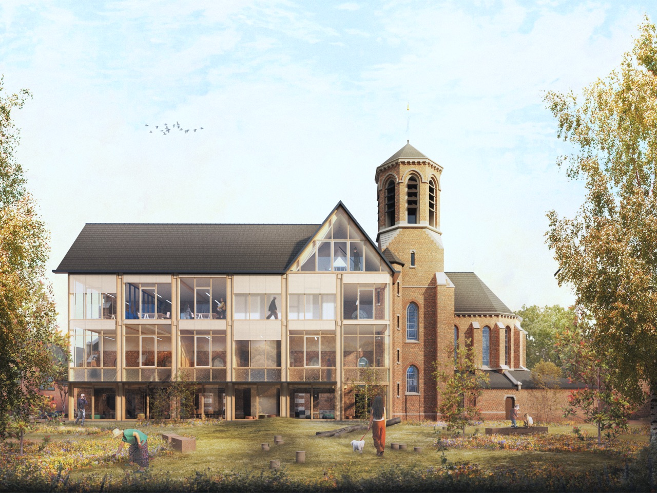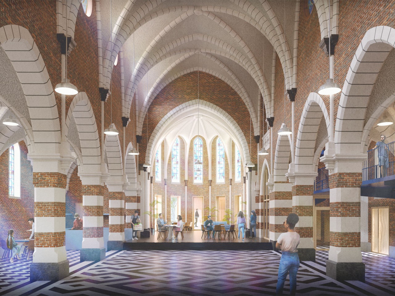 Voormalige kerk wordt kantoorgebouw met buurtfuncties (OFFICEU architects)