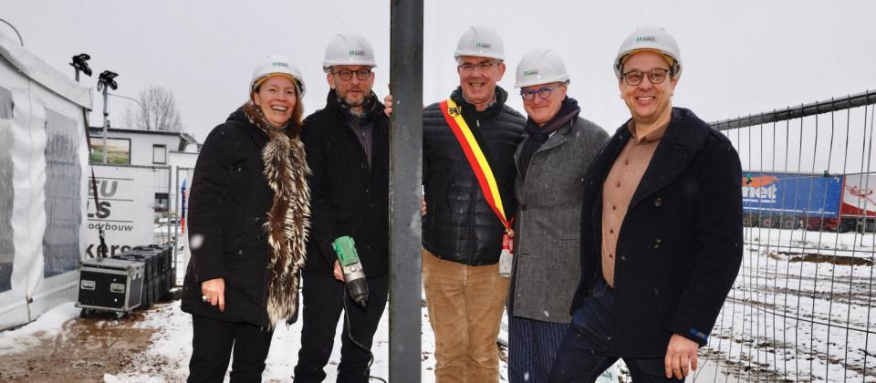 De Vlier Real Estate legde de bouwplannen in handen van ‘voordenkend’ bouwbedrijf Mathieu Gijbels. Vorige maand startten de afbraakwerken van de oude gebouwen. Ondertussen wordt er gewerkt aan de bouw van de eerste blok. “In totaal bestaat het project uit 5 blokken die allen klaar zullen zijn tegen eind 2023. Zodat in 2024 de lokale economie in Boutersem kan floreren.”, vertelt Geert Flipkens, bouwadviseur Mathieu Gijbels. In aanwezigheid van alle partijen werd deze ochtend symbolisch de eerste kolom geplaatst, het officiële startschot van de werken.