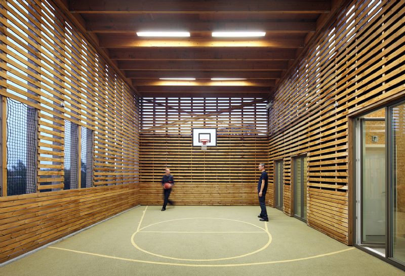 De fitnessruimte wordt geflankeerd door een tweede buitenruimte voor sportactiviteiten. Dit buitensportveld heeft een transparante bekleding en laat zo –anders dan de patio – wél een relatie met de buitenwereld toe. Die relatie wordt bestendigd door de buitentrap. Via deze weg kunnen de brandweerlieden rechtstreeks naar de parking. Een open trap verbindt de penthouse met de kantoren. De kantoren kunnen gezien worden als een overgangszone tussen het wonen en het hardere programma. Van hieruit is er een visuele relatie met de brandweerwagens, en met de straat. Op de tussenlaag bevinden zich ook de kleedruimtes, de douches en de EHBO. Beneden liggen de functies geplooid rondom de garage. Een zijdelingse dienstingang sluit aan op het parkeerterrein en de fietsenberging.