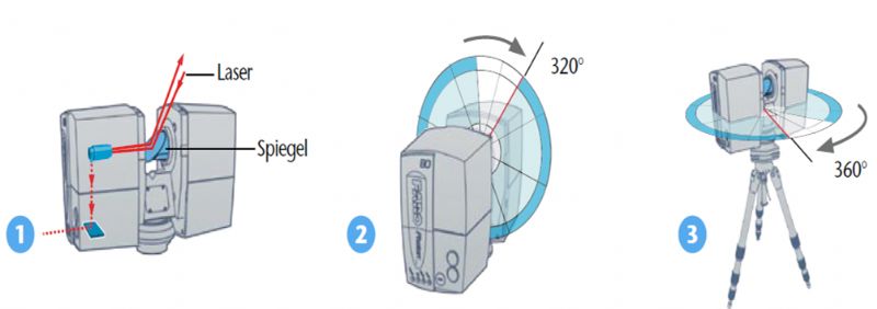 De laserscanner meet alles binnen zijn bereik in 3 dimensies. Punten die de laserstraal terugkaatst, worden omgezet in pixels. Ze leveren een puntenwolk op van tientallen miljoenen punten, welke elk een x-, y-, z- en reflectiewaarde hebben. Door het combineren van verschillende standplaatsen krijgen we een totaalbeeld. De maximale scan afstand kan ingesteld worden tot 120 meter en dit met een nauwkeurigheid van 2 a 3 mm.
