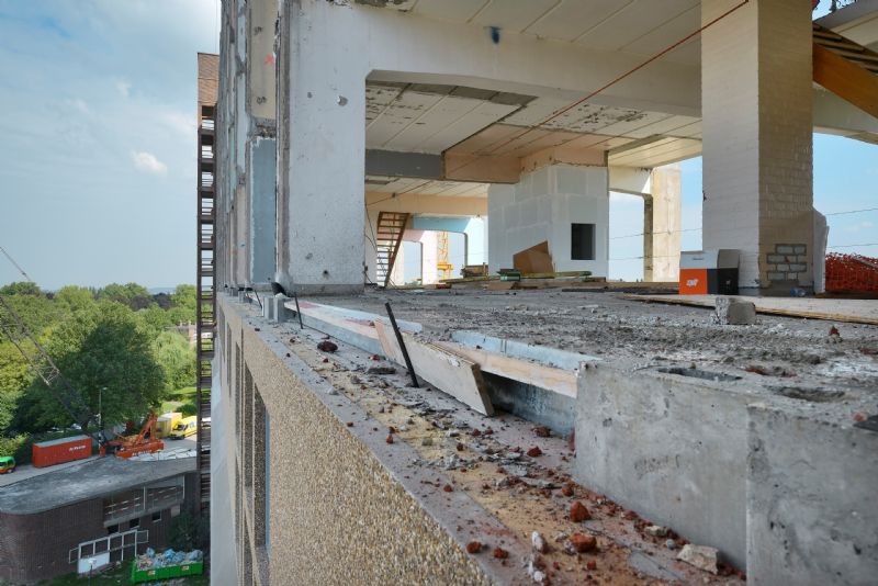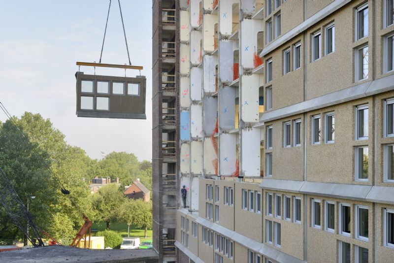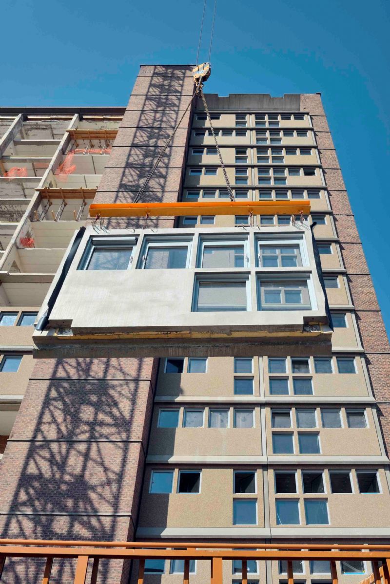 De belangrijkste keuze in het renovatieproject bestaat erin om de gevel in haar logica, vormgeving en materialiteit te reconstrueren in een nieuw betonnen sandwichpaneel, geprefabriceerd volgens de huidige technologie en volgens de huidig geldende normen. De huid van het gebouw wordt hierbij thermisch losgekoppeld van de structuur. De bestaande appartementen worden akoestisch en thermisch geïsoleerd.