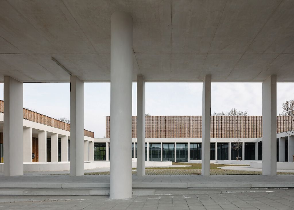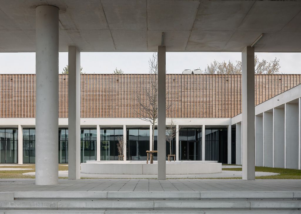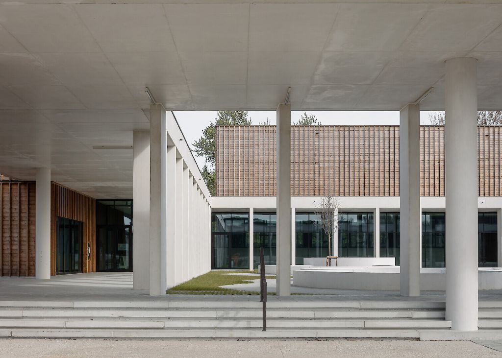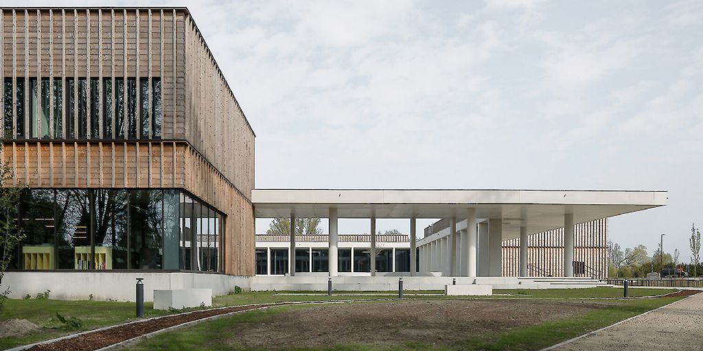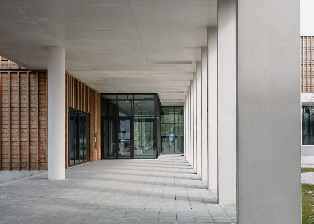 De vier hoofdvolumes zijn opgevat als eenvoudige volumes met een sokkel in geprefabriceerd, lichtgrijs architectonisch beton. De bovenzijde van de gevelvlakken is telkens voorzien van een buitenafwerking met houten lattenwerk in verduurzaamd hout. Het ritme van de beplanking genereert een gevelbeeld met een opvallende gelaagdheid en diepte. De neutrale, ritmische gevel vormt een sprekende maar discrete achtergrond waartegen andere elementen tot hun recht komen: de colonnade in architectonisch beton, de bomen, de begroening en de mensen; het leven zelf.