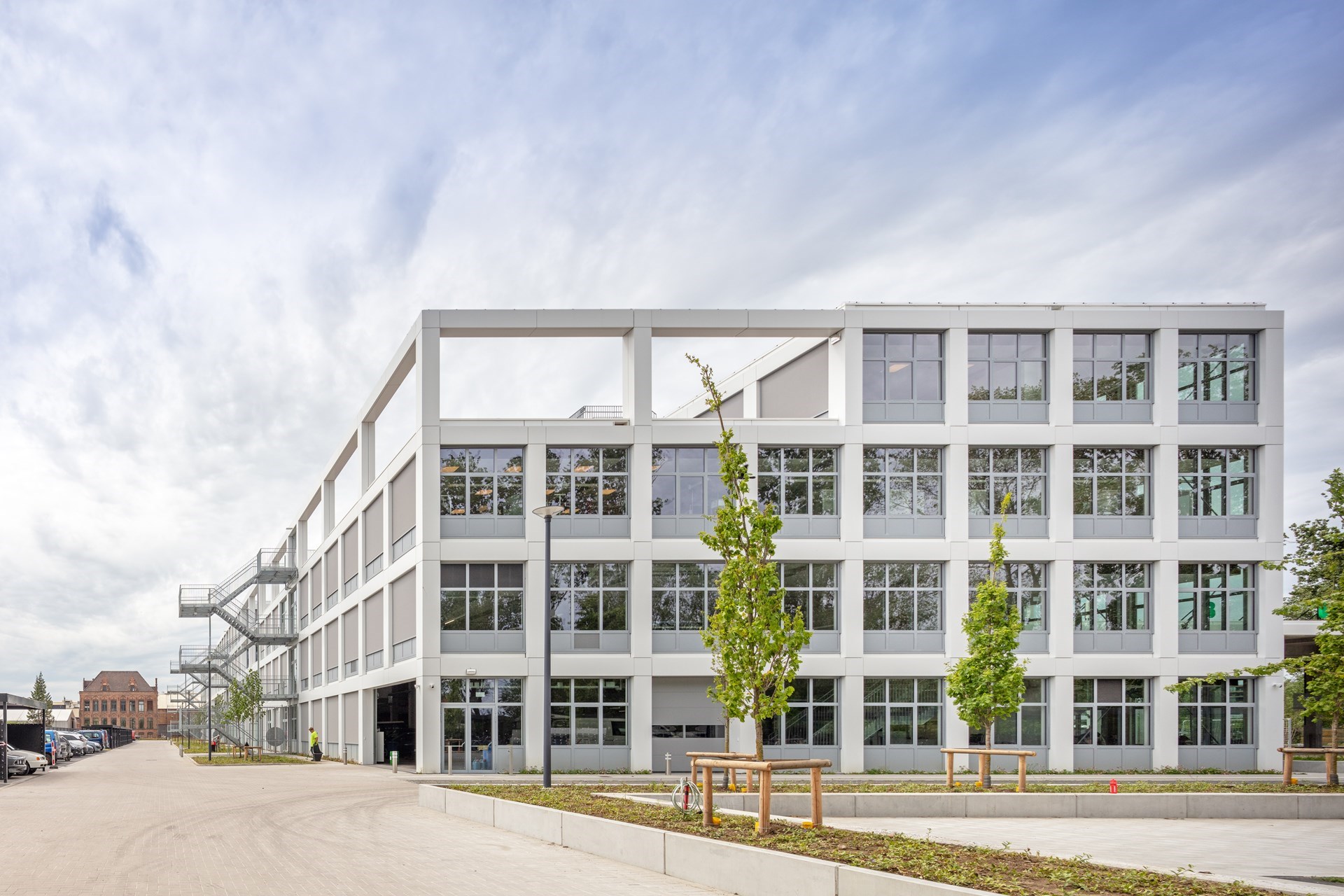 Ook de gevel is modulair opgebouwd met metalen composiet panelen in een structuur van betonnen kolommen en vloeren.