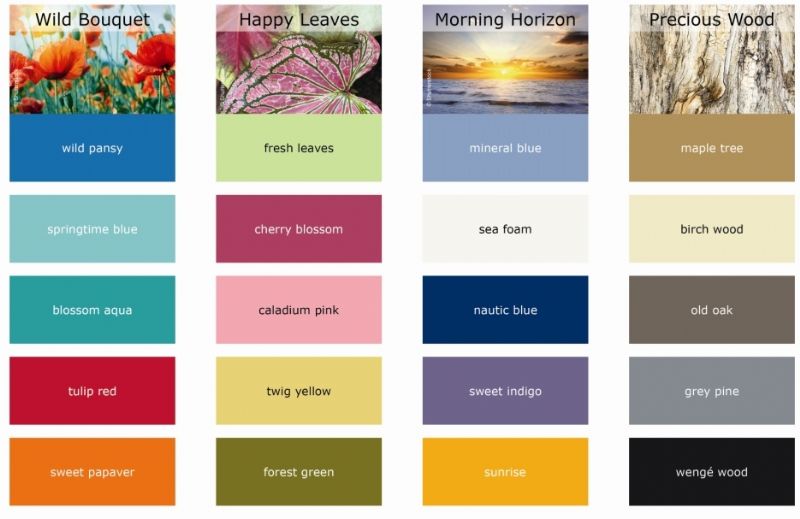 - Happy Leaves verrast met kleuren van frisse lenteblaadjes, onder meer kersenbloesem, caladiumroze, boterbloemgeel en woudgroen;