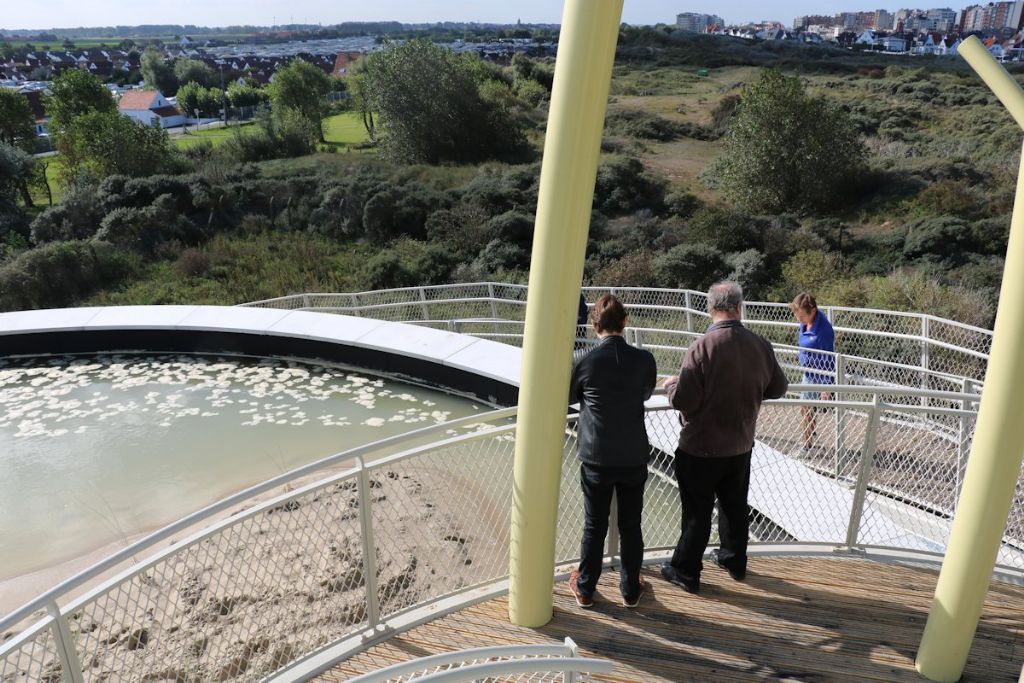 Een verhoogd houten knuppelpad dat overgaat in een brugconstructie beperkt de impact op het maaiveld. De natuur, het zand en de wind krijgen vrij spel. Het looppad slingert verder rond de restanten van de watertoren en geeft uit op een 7 meter hoog gesitueerd uitkijkplatform. Dit platform is toegankelijk gemaakt voor rolstoelgebruikers en kinderwagens. Het biedt niet alleen een eerste prachtig uitzicht op het natuurgebied en op de omgeving maar ook op een kunstmatig gecreëerde vijver bovenop de oude basis van de watertoren. Deze waterpartij is niet enkel een echo naar de vorige functie van het gebouw, maar ook een herhaling, versterking van de reeds aanwezige amfibiënpoel. De fauna en flora van het gebied worden dichter bij de bezoekers gebracht. Zelfs de overloop van de poel is zodanig vormgegeven dat hij dienst doet als ‘amfibiëntrap’ van het maaiveld naar de vijver.