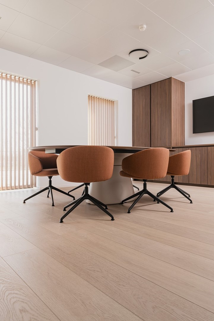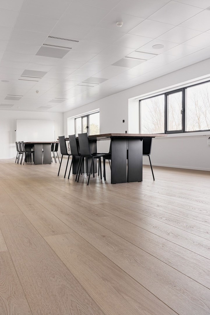 Sabine koos voor vloeren die niet alleen esthetisch aangenaam zijn maar ook buitengewoon praktisch. "De COREtec® vloeren hebben de natuurlijke look van steen en hout die perfect past in onze kantooromgeving, maar zonder de nadelen zoals deukjes van meubelpoten of slijtage door voetverkeer," legt ze uit. De unieke samenstelling van een sterke vinyllaag met hoogwaardige slijtlagen maakt deze vloeren ideaal voor het intensieve kantoorleven.