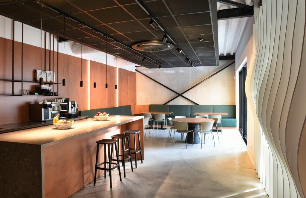“Het was zaak om er niet zomaar wat losse meubels te plaatsen, maar een uitnodigend geheel te creëren”, legt Dorien Limerkens uit. “We kozen voor een combinatie van verschillende materialen die samen warmte uitstralen, diverse zitmogelijkheden (bank, stoel, kruk) en variabele manieren van verlichten (spots, pendels, indirect), zodat de medewerkers zich er echt comfortabel voelen en naar hartenlust kunnen ontspannen.”