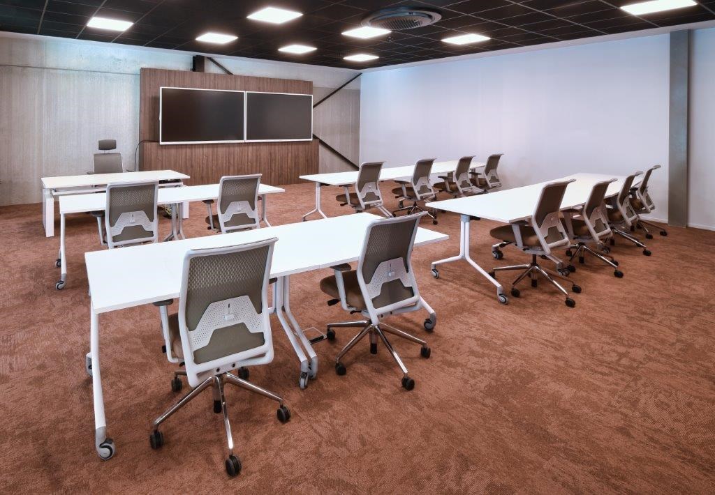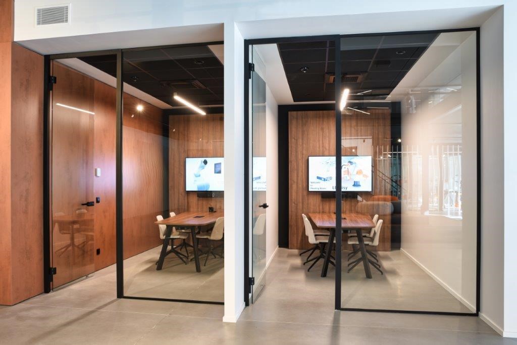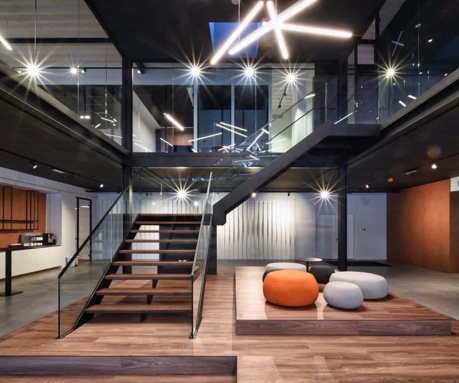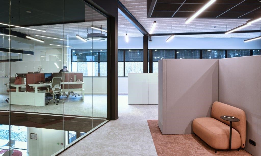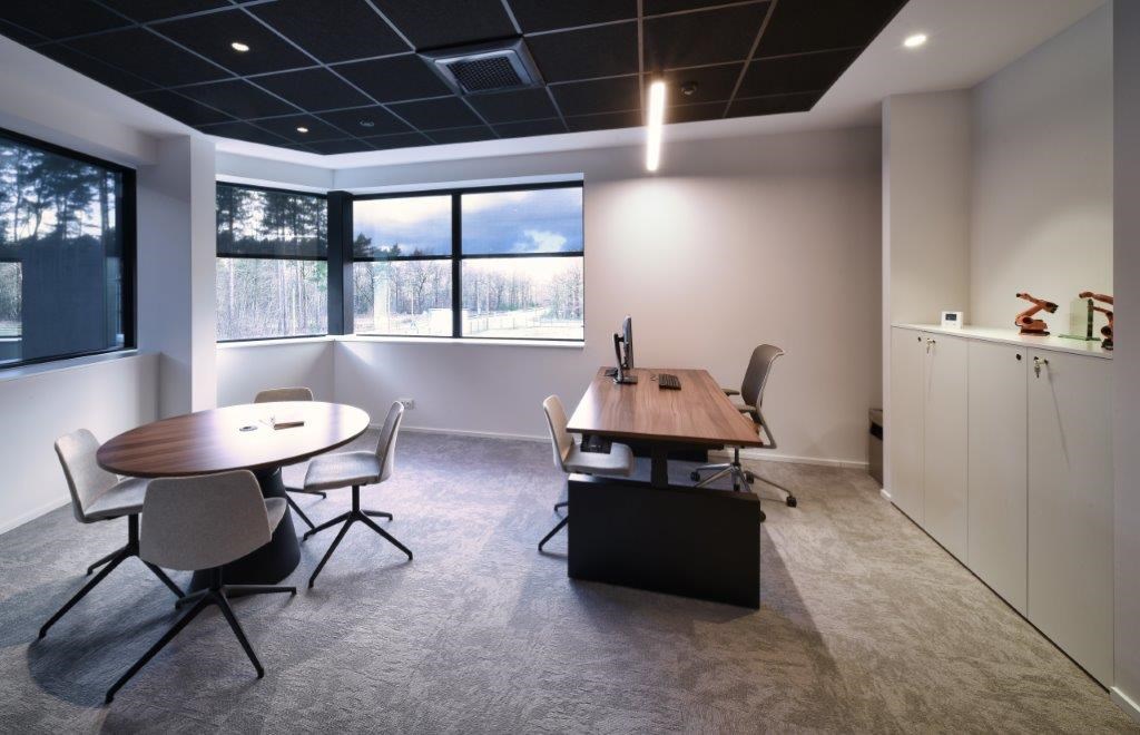 “Het bezoekers- en trainingscentrum, waar klanten en medewerkers kunnen kennismaken met de allernieuwste robottechnologieën, zijn ondergebracht op het ruime gelijkvloers, net als enkele meetingrooms en het magazijn. De eerste verdieping is voorbehouden voor grotendeels open kantoorruimte, waar ‘space planning’ echt wel key was. Denk aan flexwerkplekken met ergonomische zit-stabureaus, lockers voor persoonlijke spullen, informele zithoeken, phoneboots en specifieke concentratiekantoren. Kortom: het ‘nieuwe werken’, afgestemd op het DNA van het bedrijf."
