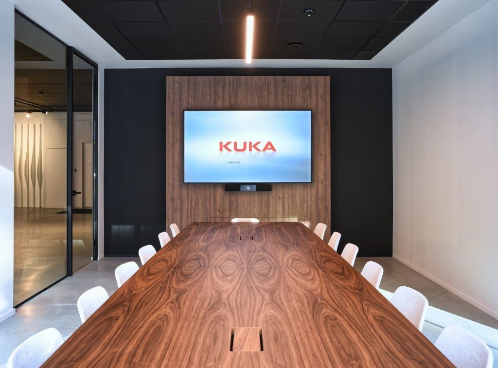 Het nieuwe KUKA-gebouw biedt plaats aan dertig medewerkers en herbergt de nieuwste technologieën en innovaties op het vlak van robotisering en automatisering. Het interieurontwerp is van de hand van LINT Interieurarchitectuur, dat voor een uitdagende evenwichtsoefening stond. “We moesten zowel de hoogtechnologische identiteit van KUKA in de verf zetten als een aangename werkomgeving met een ‘huiselijker’ gevoel creëren voor het menselijke kapitaal van het bedrijf. Het kantoorgedeelte mocht qua look-and-feel losstaan van die typische cleane KUKA-stijl”, vertelt interieurarchitect-zaakvoerder Dorien Limerkens.