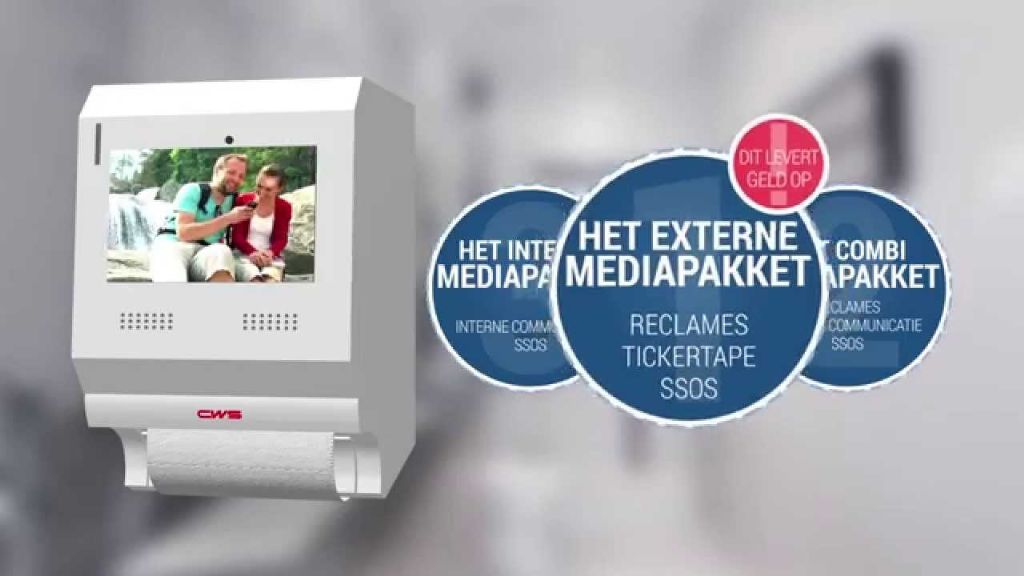 Uit onderzoek is gebleken dat toiletgebruikers de sanitaire ruimte een geschikte locatie vinden om te communiceren. CWS lanceert daarom Washroom Media, een nieuw visueel én auditief marketing- en communicatiemedium op een plek waar we dagelijks komen. De sanitaire ruimte. De informatie wordt weergegeven via een handdoekautomaat* in een fraai design met daarin een volledig geï ntegreerd screen met beeld en geluid. Dit nieuwe medium staat garant voor een directe vorm van communicatie met toiletgebruikers, uw medewerkers en/of relaties.