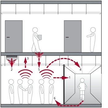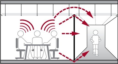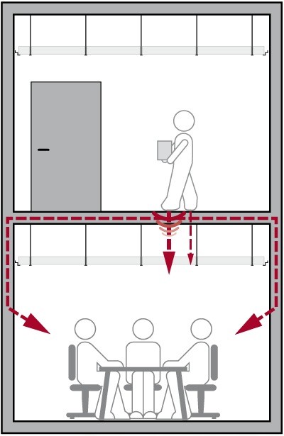 - Omloopgeluid: geluid dat de ruimte binnendringt via vloeren, aangrenzende gangen, het gemeenschappelijke plafondplenum, slecht geïsoleerde vloeren, installaties, enz.