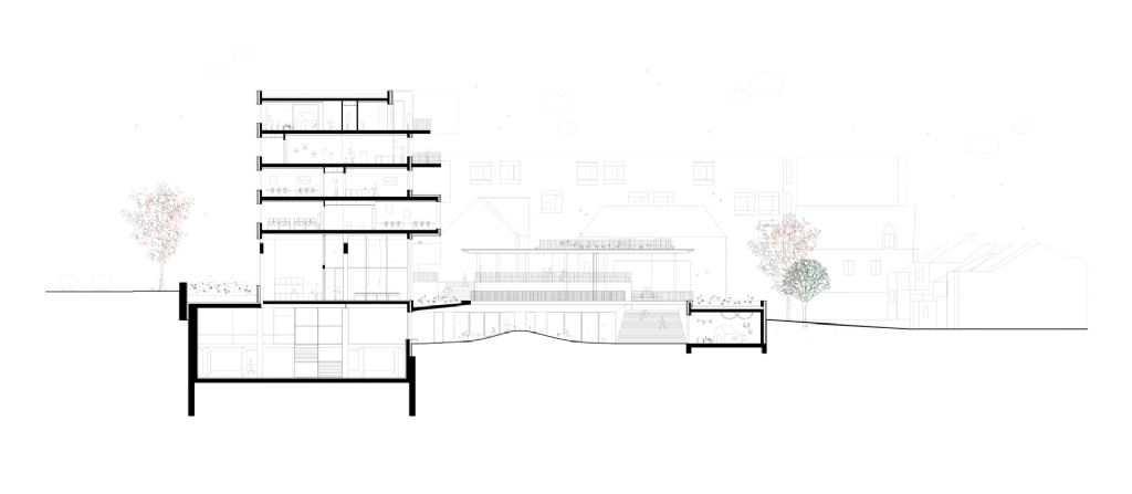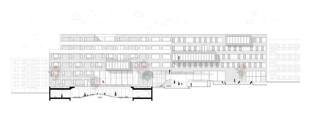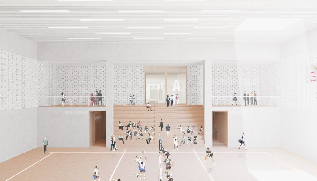 Daarnaast zijn de twee grote sportzalen onder het hoofdvolume gepositioneerd, om zo de druk op de site sterk te reduceren. Ook hierbij zet LOW architecten in op een doorlaatbaar en natuurlijk landschap in de tuinzone, wat op zijn beurt voordelen biedt aan de waterhuishouding, biodiversiteit, etc.