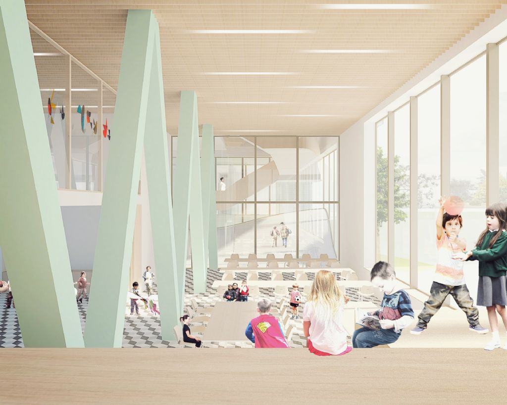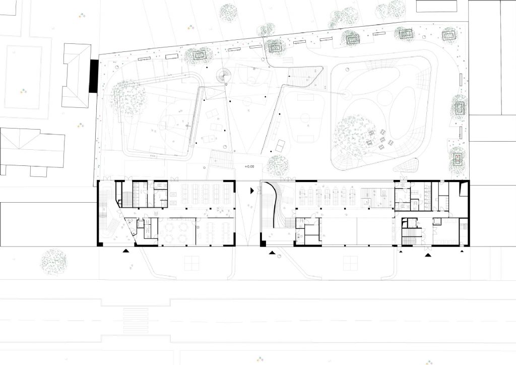 Er is sterk ingezet op architecturale ingrepen die de kwaliteit van het lesgeven en het schoolgebeuren verhogen. Er zijn uitkragende volumes die klassen van terrassen voorzien om buiten les te kunnen geven. Verbredingen in de gangen creëren ruimtes voor informeel overleg en studie. Buiten wordt er letterlijk op verschillende niveaus gespeeld. “Het binnengebied is veel meer dan een gewone speelplaats. Door de bestaande hellingen te gebruiken en te versterken creëren we een landschap van speel-, sport- en groenzones. Op het dak van de grote luifel installeren we een moestuin en in de kleuterkuil komt een waterval uit die de natuurlijke infiltratie van het regenwater illustreert”, aldus LOW architecten.