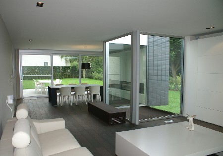De grens tussen binnen- en buitenruimte is dun door de grote en vele glaspartijen. Toch is de privacy in de woning echter maximaal door het optrekken van een spouwmuur aan de straatzijde.