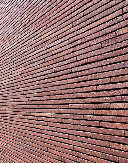 Links: de bijzondere structuur van de Marono Extra. Rechts: Een realisatie met Marono Rood (arch. Kennes, Elegeert).