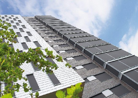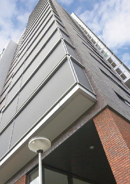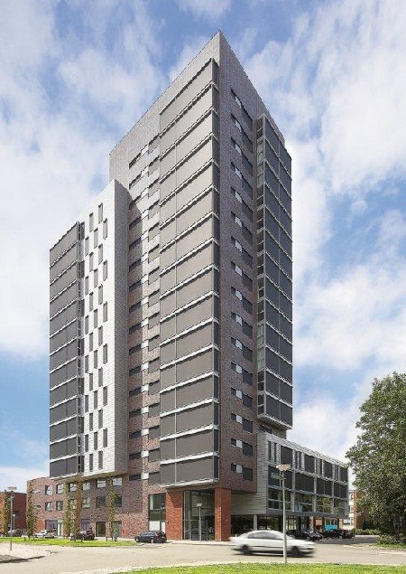 In een woontoren in Groningen werd RENSON Fixscreen zonwering geïnstalleerd om oververhitting in het gebouw te voorkomen. De binnentemperatuur kan nu efficiënt geregeld worden door 326 windvaste screens met een ingenieus automatisch besturingssysteem op basis van zon- en windsensoren.