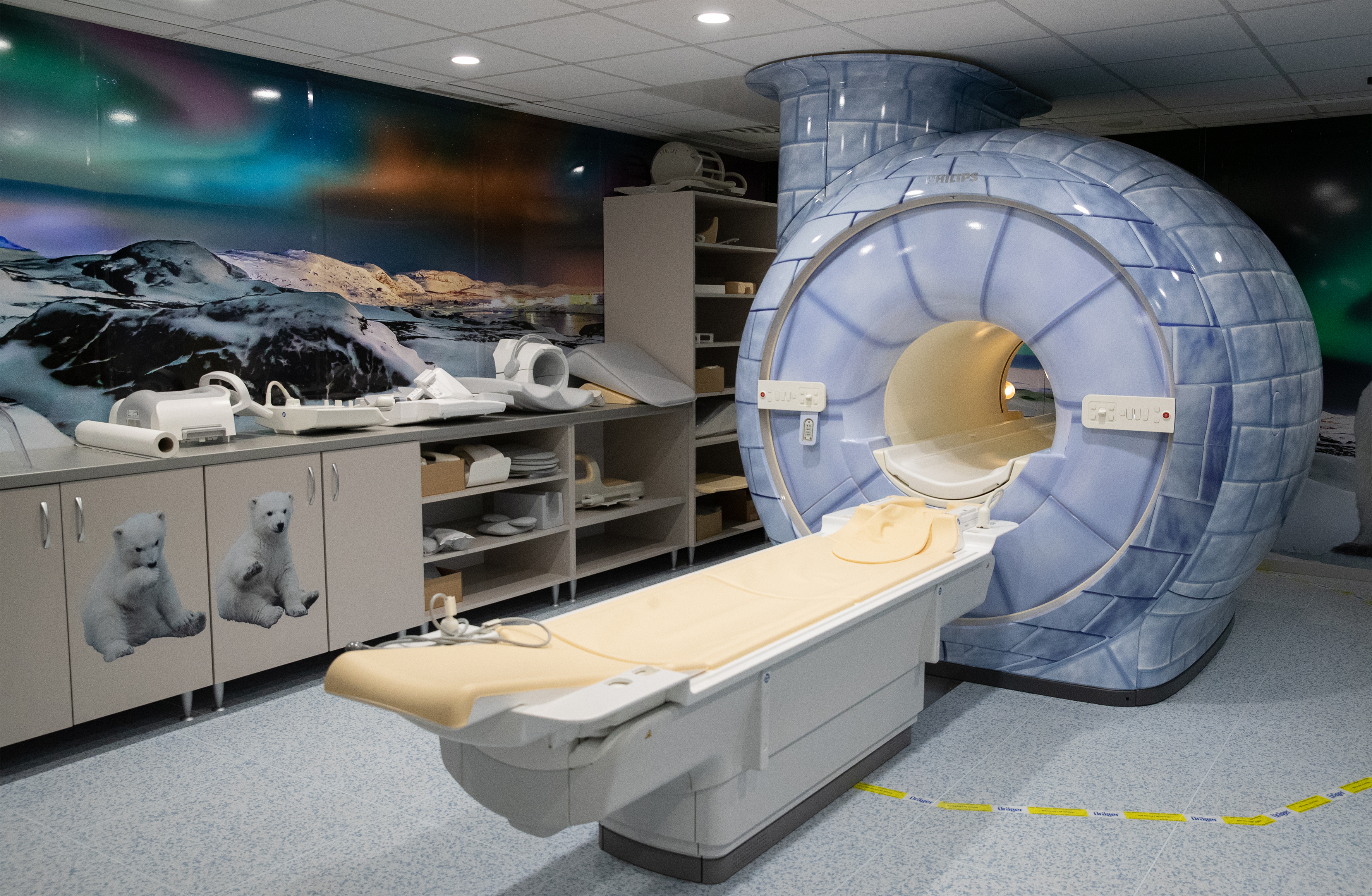 Andrea Böjtös van Triform Neon KFT transformeerde een MRI scanner in het Heim Pál Children’s Hospital in Hongarije in een iglo om kinderen gerust te stellen vóór een onderzoek. Dat nobele doel leverde de Hongaarse de publieksprijs van de Antalis Interior Design Award op. Designer Berta Judit ontwierp een bijpassende muurdecoratie inclusief noorderlicht en schattige ijsberen.