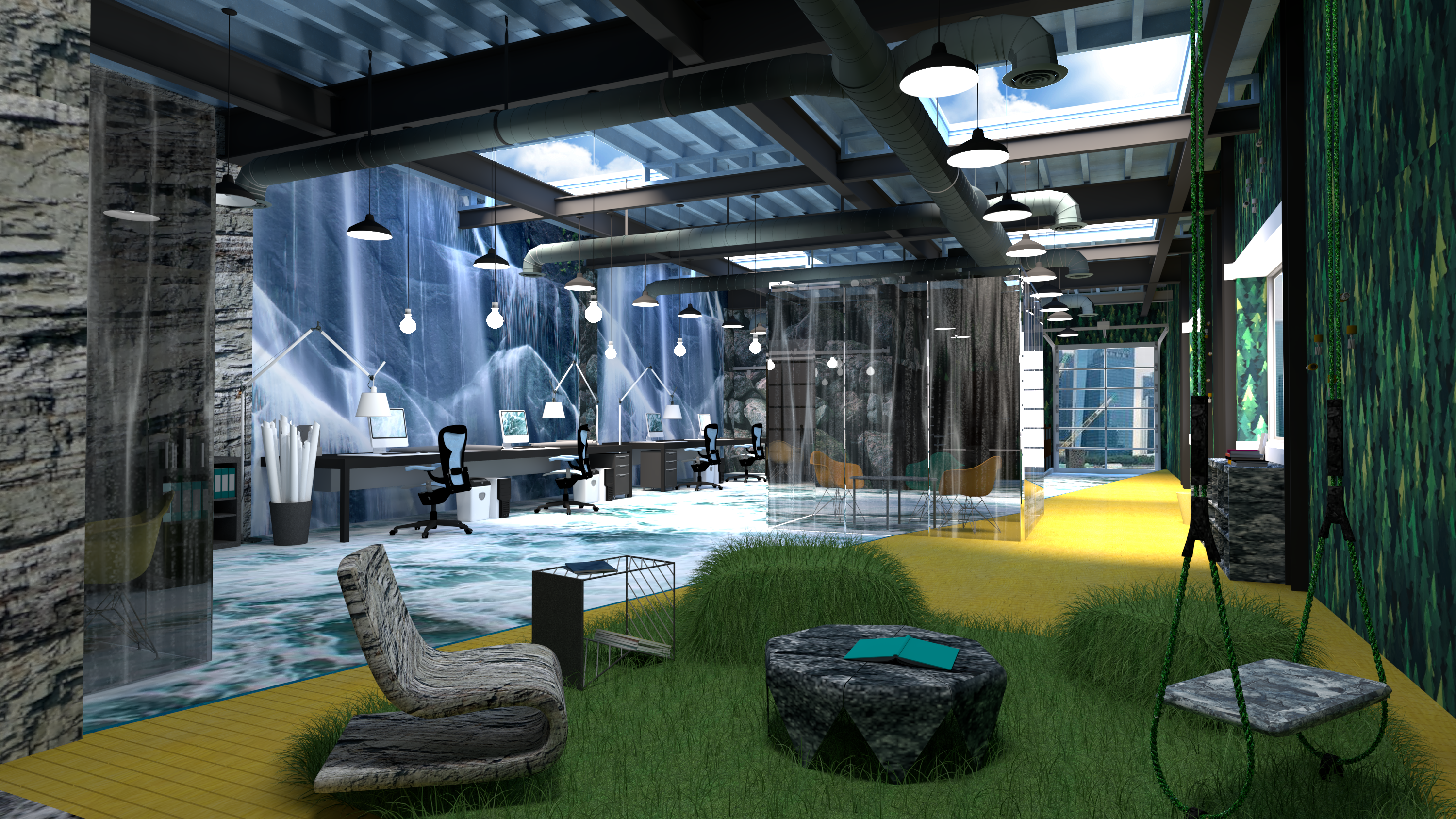 Van alle inzendingen ontwierp Gertruda Ravluseviciute, studente aan Vilnius College of Technologies and Design, het beste 3D-project. Met enkel een wit model ter beschikking creëerde de Litouwse studente een 3D-simulatie waarin ze het kantoor van de toekomst uittekende. Voor dat futuristische kantoor baseerde ze zich op een waterval en diens omgeving. Door kantoren navenant dit natuurfenomeen vorm te geven – grasgroene tapijten en blauwe en groene muren met patroon inclusief - kunnen werknemers hun eigen ritme terugvinden en zich tegelijkertijd even ergens anders wanen.