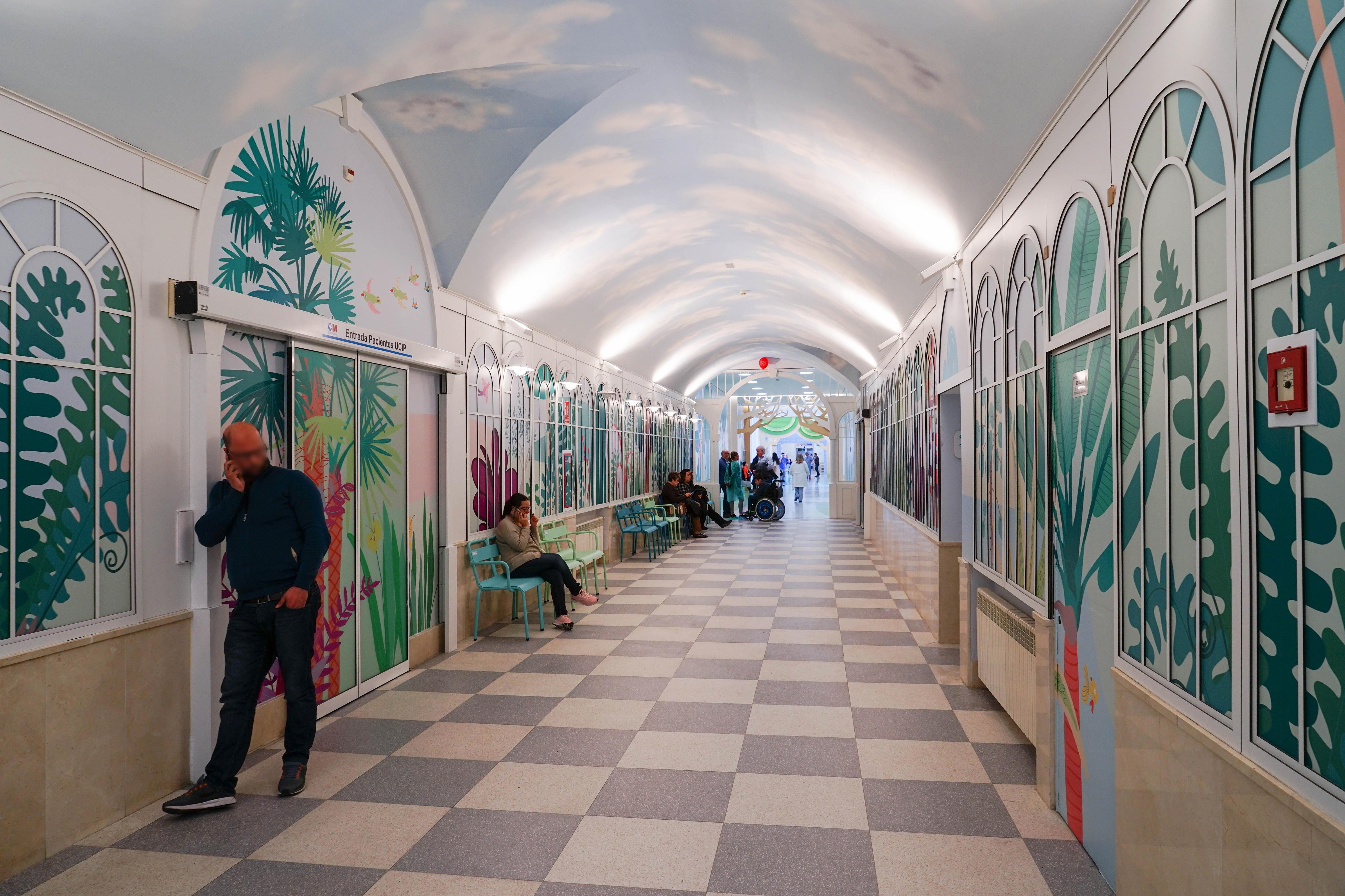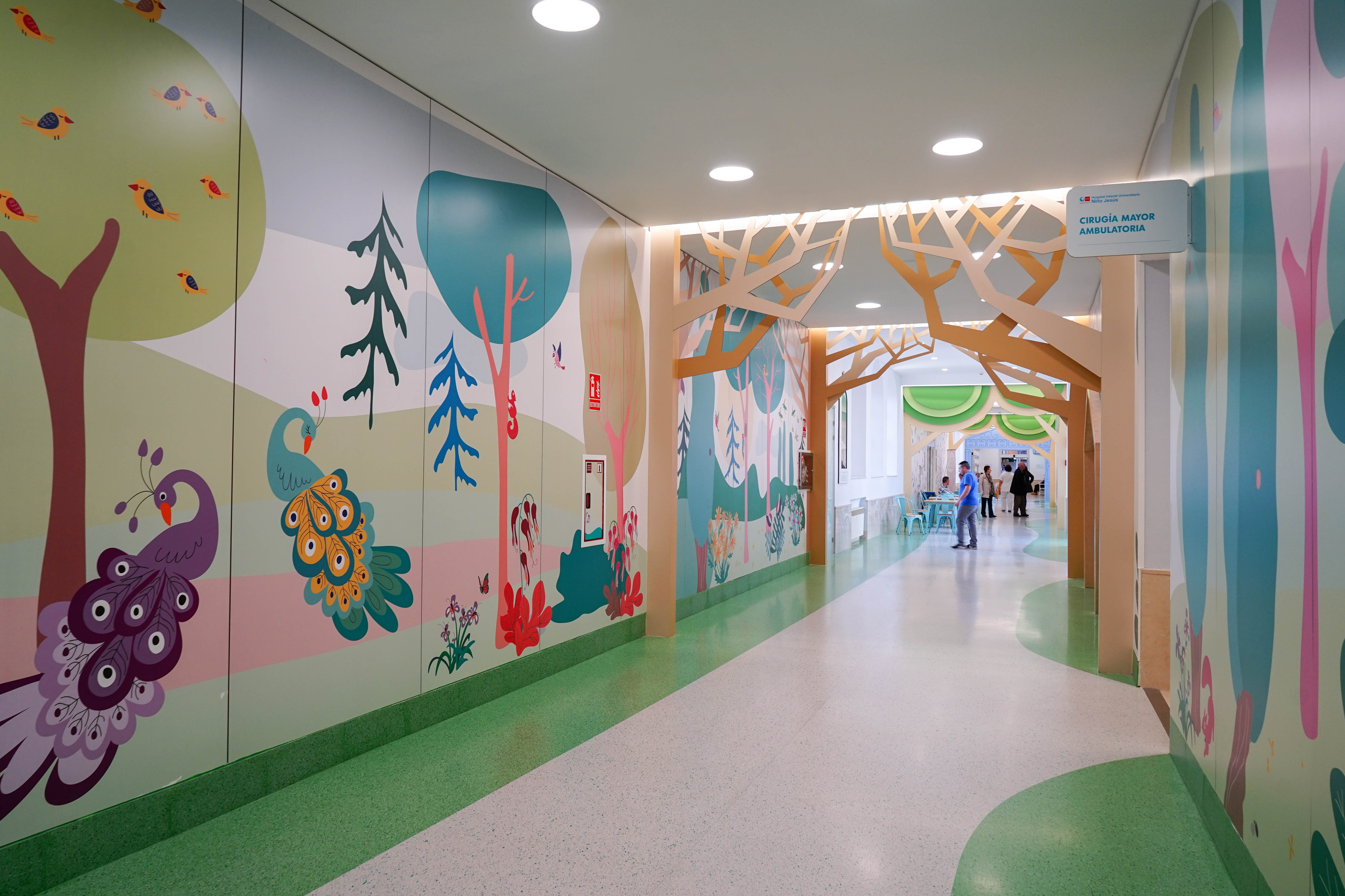 Ordás decoreerde het plafond, de vloer, de muren en de verlichting van het kinderziekenhuis. Inspiratie daarvoor haalde hij uit een wandeling door het nabijgelegen El Retiro park. Zo markeren houten drempels of deuren met ‘bomen’ de verschillende ruimtes van het kinderziekenhuis. De muren zijn op hun beurt versierd met geprint AVERY MPI 320 vinyl bedekt met een beschermende laag COALA 1D LAM MATT van Antalis. Het plafond kreeg aangepast behangpapier met een blauwe lucht en wolken.