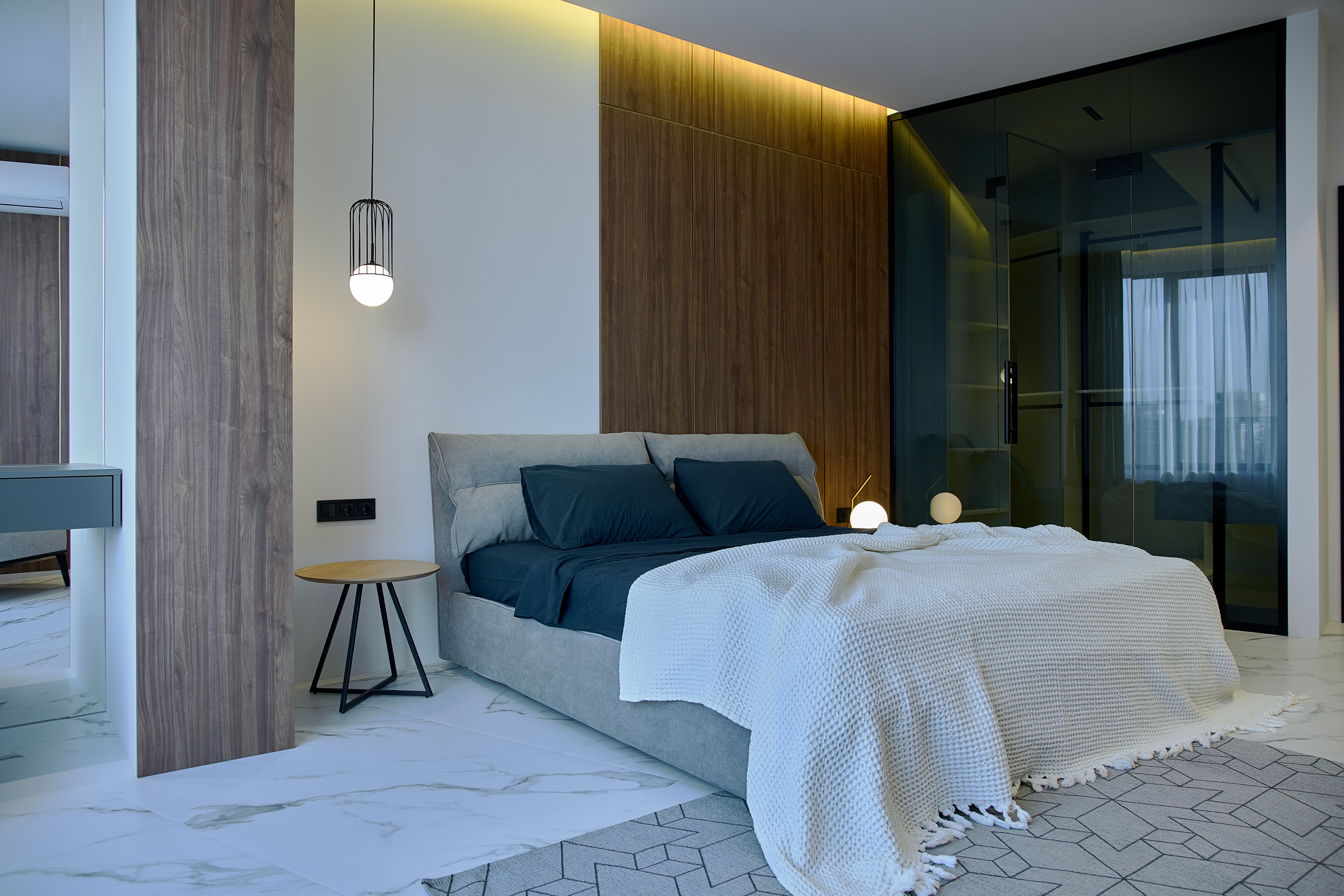 Laura Pietrusel van Alderaminro was de beste in de categorie home met een hedendaags interieurontwerp van het Bloom appartement in Roemenië. Pietrusel gebruikte daartoe lichte kleuren en voegde materiaaleffecten toe aan de muren met behulp van aangepast behangpapier. De grijze wanden werden bijvoorbeeld voorzien van Coala Walldesign Sand nonwoven, digitaal geprint behangpapier van Antalis. Zijn enerzijds ruwe en anderzijds delicate textuur wekken de illusie dat het om een natuurlijk materiaal gaat.
