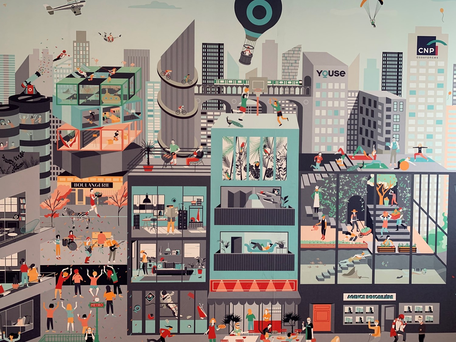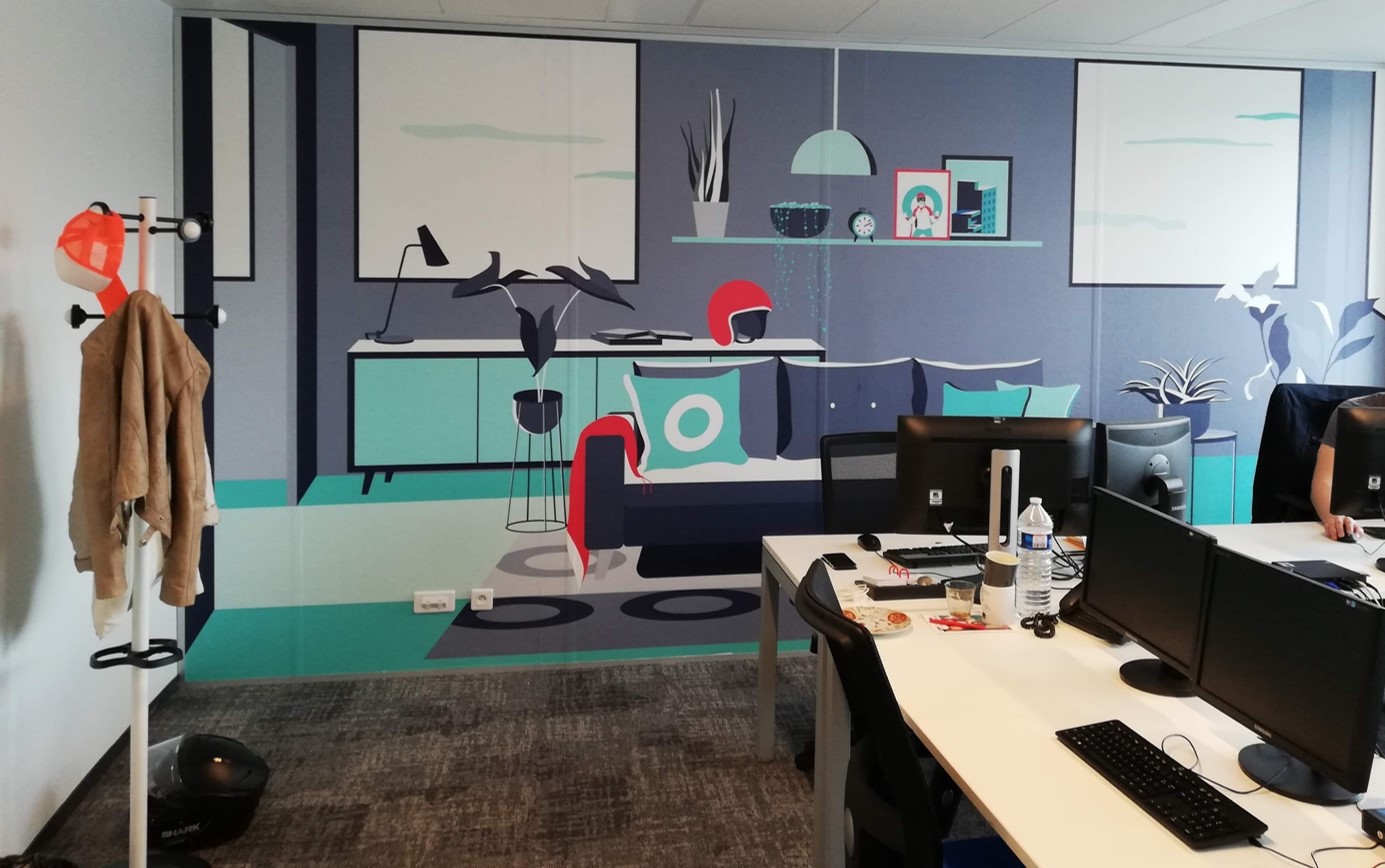 Ook Marion Delage van Parégrine maakte indruk in de categorie office met haar vijf gepersonaliseerde muurschilderingen in de kantoren van het jonge vastgoedverzekeringenkantoor Youse. De grafische ontwerpen zetten niet alleen de kleuren en het logo van het bedrijf in de verf, maar ook de werknemers zelf. Doordat de vijf muurschilderingen digitaal geprint werden op Coala Walldesign Smooth Matt van Antalis, beschikt elk kantoor over een uniek design. De ontwerpen geven niet alleen een algemeen beeld van het bedrijf en zijn werknemers, maar representeren ook verschillende ruimtes - in dit geval een woonkamer, veranda en kantoor - van een appartement.