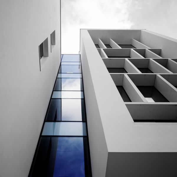 Het gebouw komt heel anders over naargelang van de richting van waaruit het benaderd wordt, maar ook naargelang van het tijdstip van de dag. De gevel biedt een heel andere aanblik als er vanuit de ene of de andere straat naartoe wordt gestapt, maar licht speelt een nog grotere rol: het witte daglicht maakt plaats voor een roodachtig licht dat uit de inkompartijen komt. Het licht en het gebruik ervan maken volledig deel uit van het gebouw. De integratie van reflectoren in de plinten is dan ook een van de elementen die het gebouw zijn veranderende aanzicht verlenen.