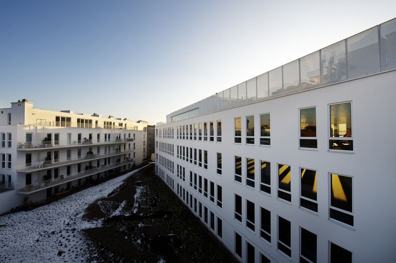 Het resultaat is een aaneenschakeling van rijzige, witte gebouwen die wordt onderbroken door de verticale lijnen van de ramen en ingangen. De bekleding van de gelijkvloerse verdieping werd uitgevoerd met grote, hoge plinten in wit architectonisch beton. De verdiepingen kregen een heel specifieke witte bepleistering. Om niet als één groot en zwaar blok over te komen, is de hoogte van de gebouwen verschillend.