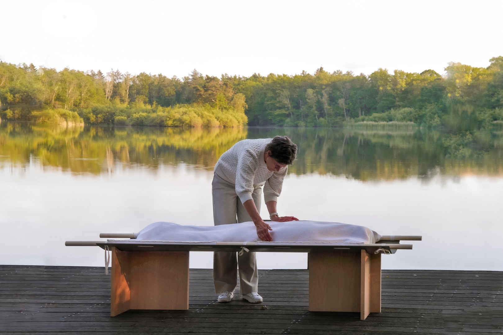 Hannah Melis gaat op zoek naar hoe je het afscheid van een overledene letterlijk en figuurlijk kan verzachten voor nabestaanden en het milieu. Haar ontwerp combineert een herinzetbare draagberrie met een zachte wollen wade die het lichaam omhult.