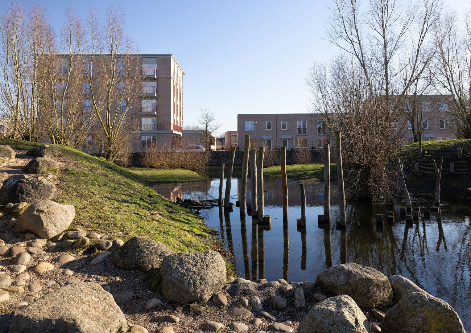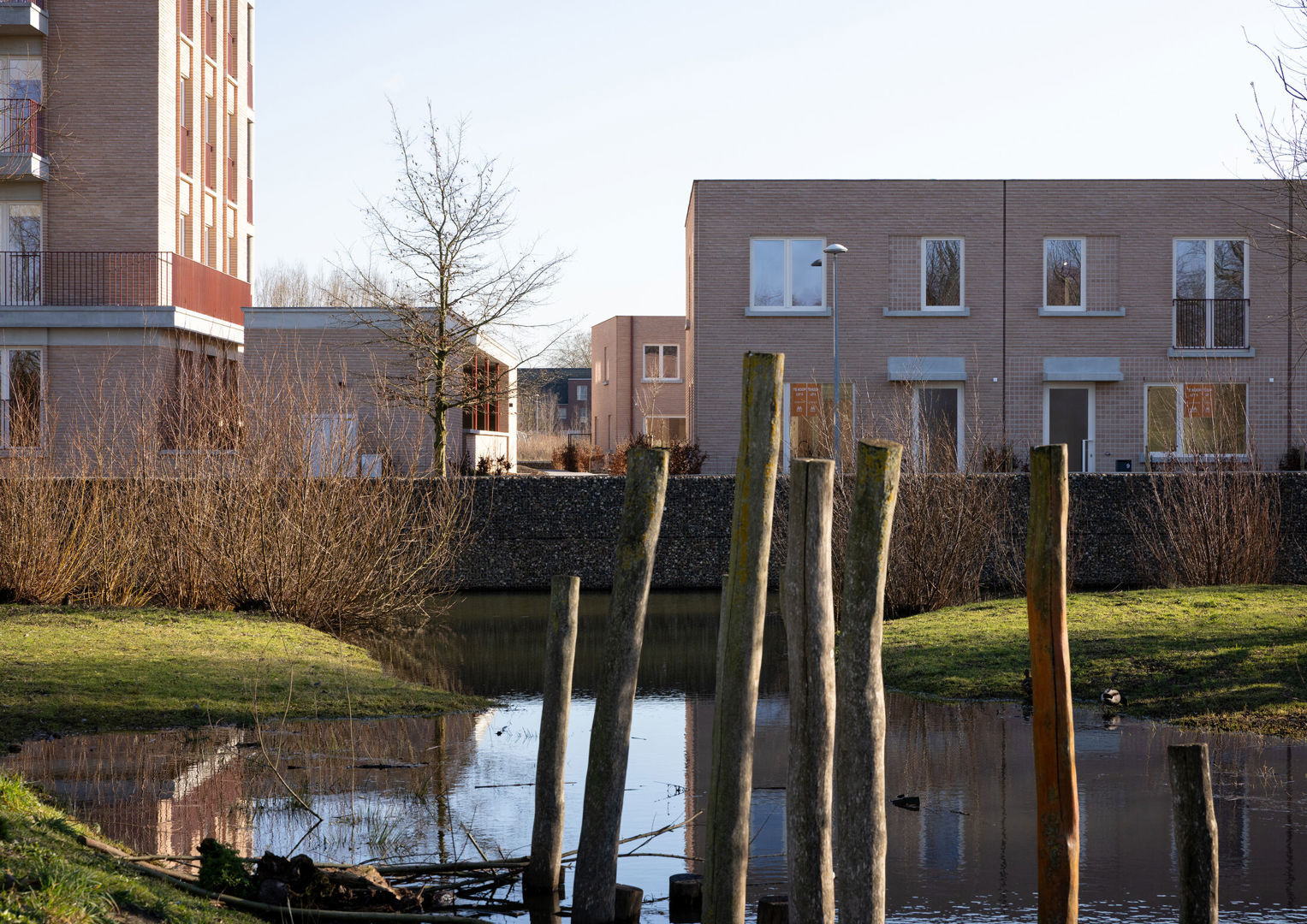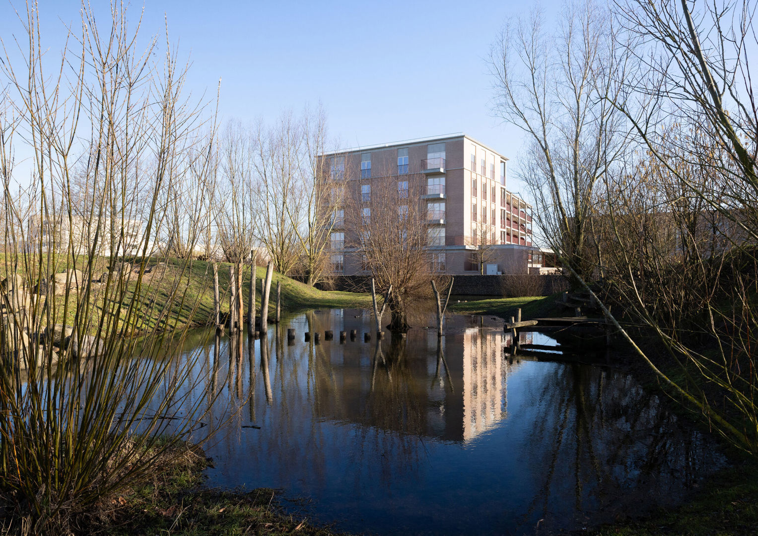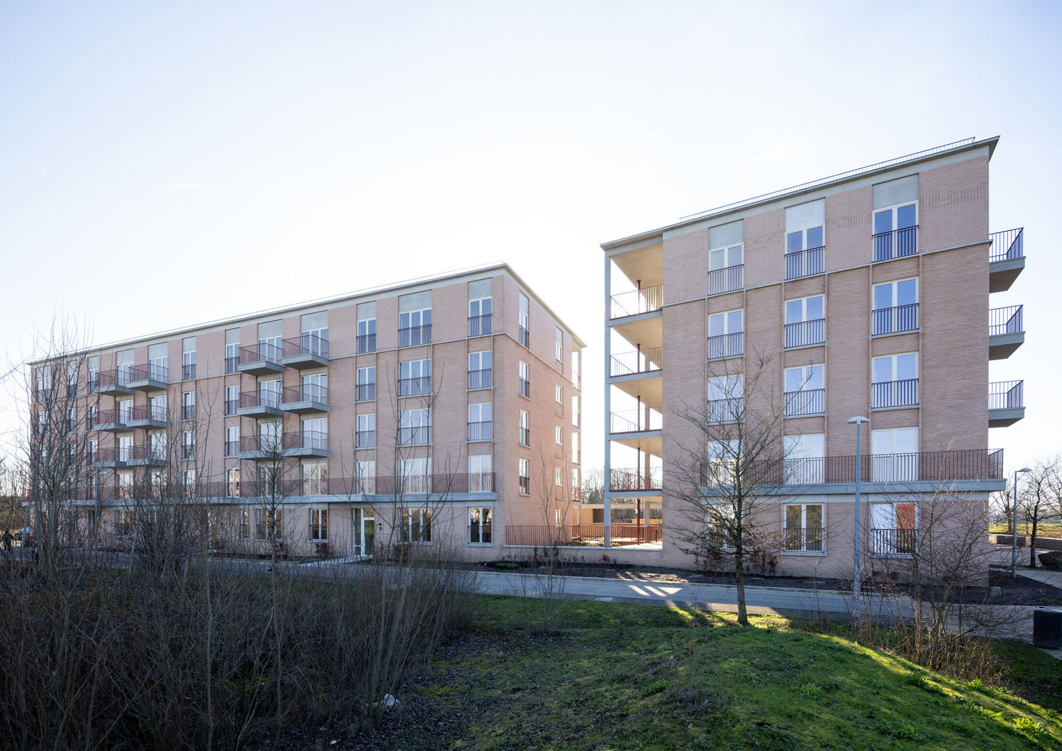 Die bijzondere ligging vertaalt zich in een uitgesproken ruimtelijke opbouw. Waar de grondgebonden woningen zich eerder bescheiden aan de randen nestelen, openen de appartementsgebouwen zich naar het landschap. Door hun positie langs het park kunnen ze hoger en compacter worden georganiseerd, zonder de menselijke schaal uit het oog te verliezen. Tegelijk ontstaat een duidelijke leesbaarheid binnen het geheel van de wijk.