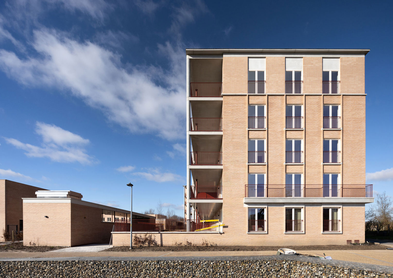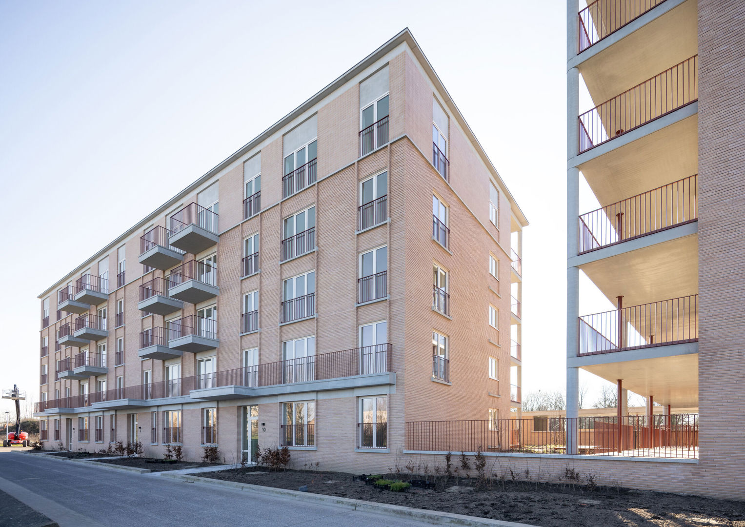 De aandacht voor materiaal zet zich door in de detaillering. Ramen, balustrades en terrassen maken integraal deel uit van het architecturale concept. Slanke profielen en zorgvuldige aansluitingen zorgen voor een verfijnd beeld dat de robuustheid van de baksteen nuanceert.