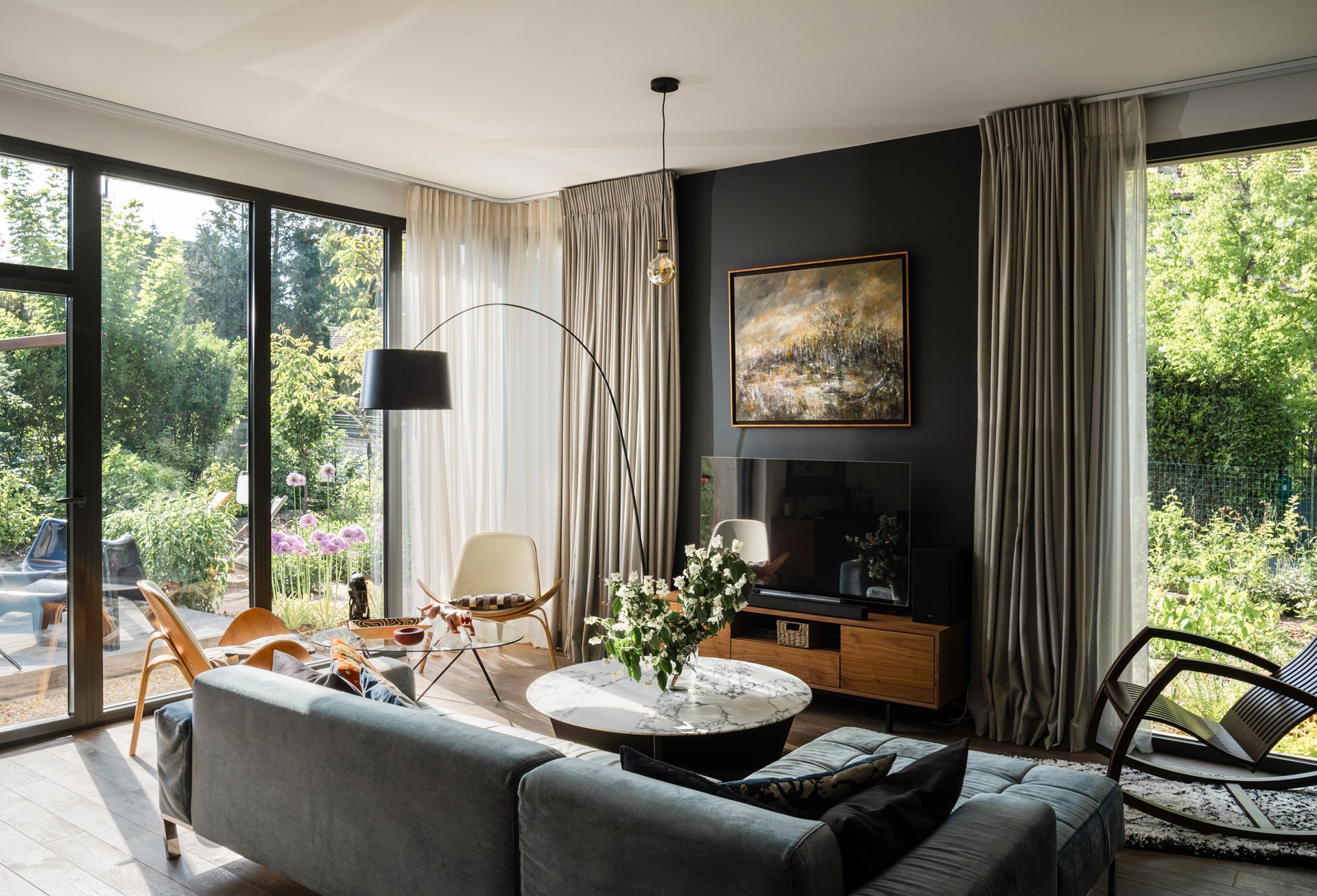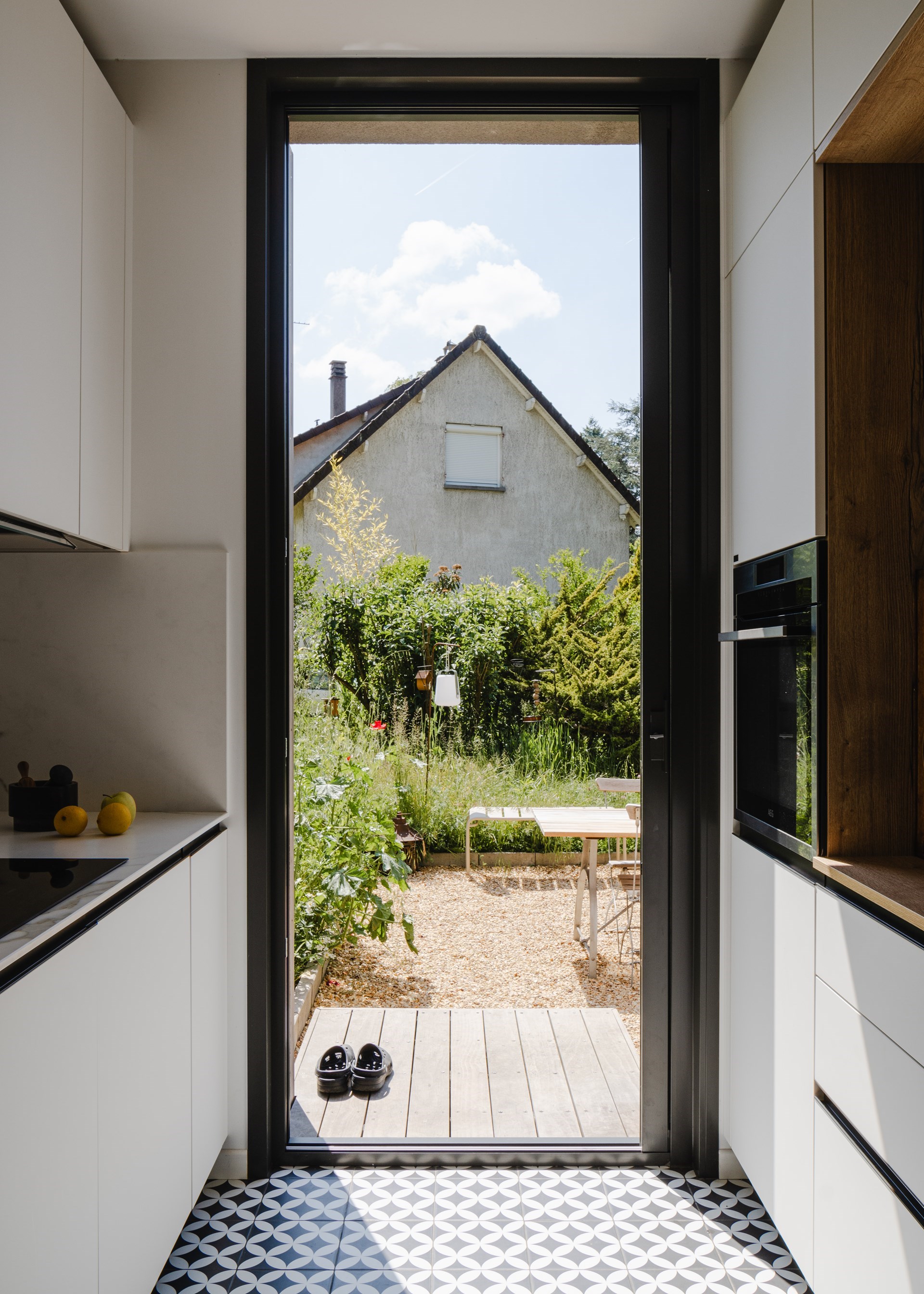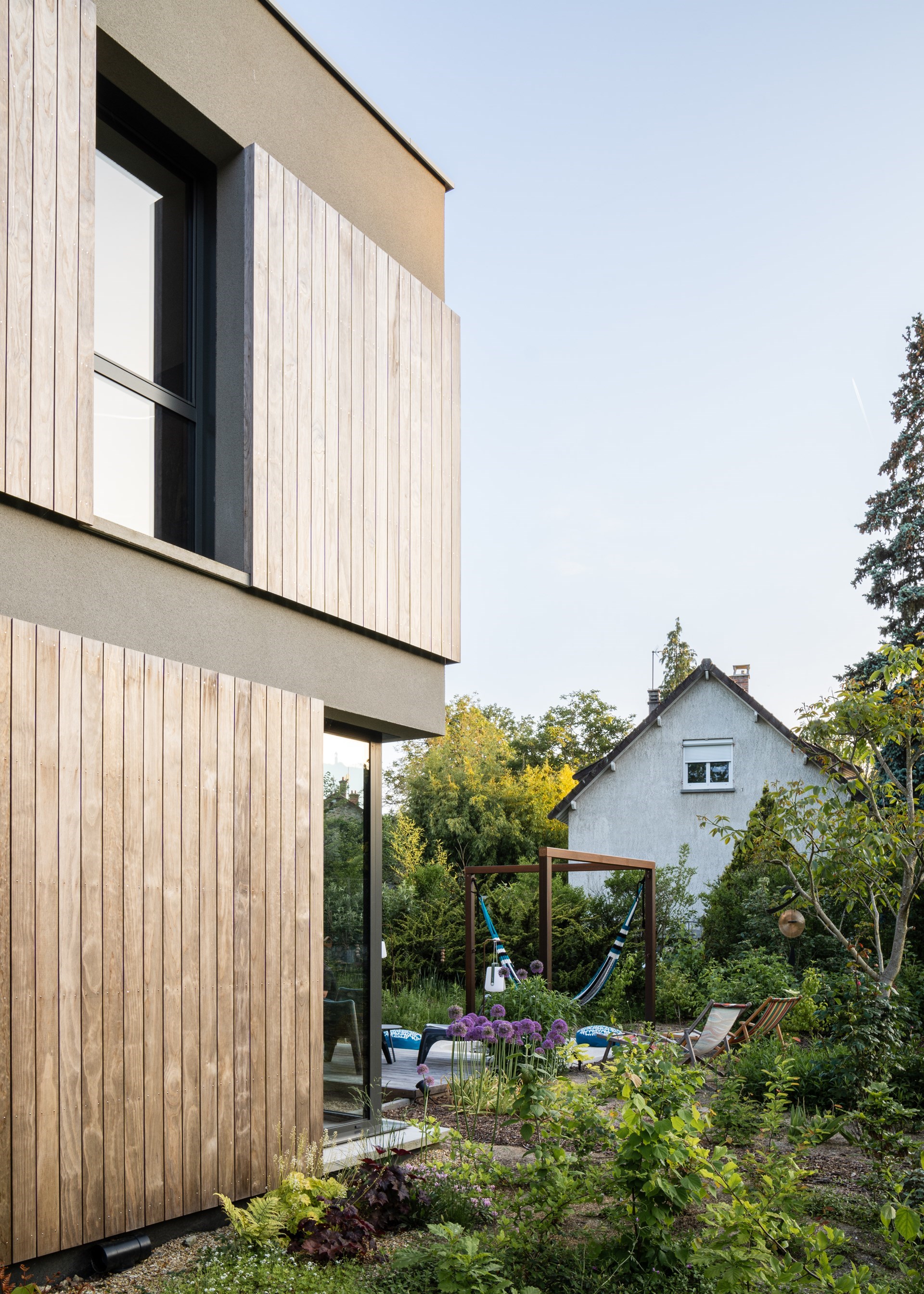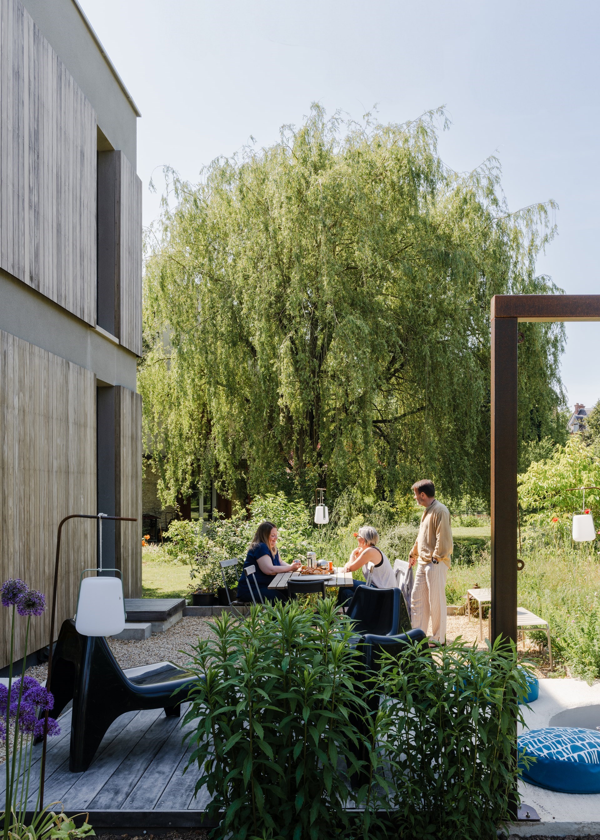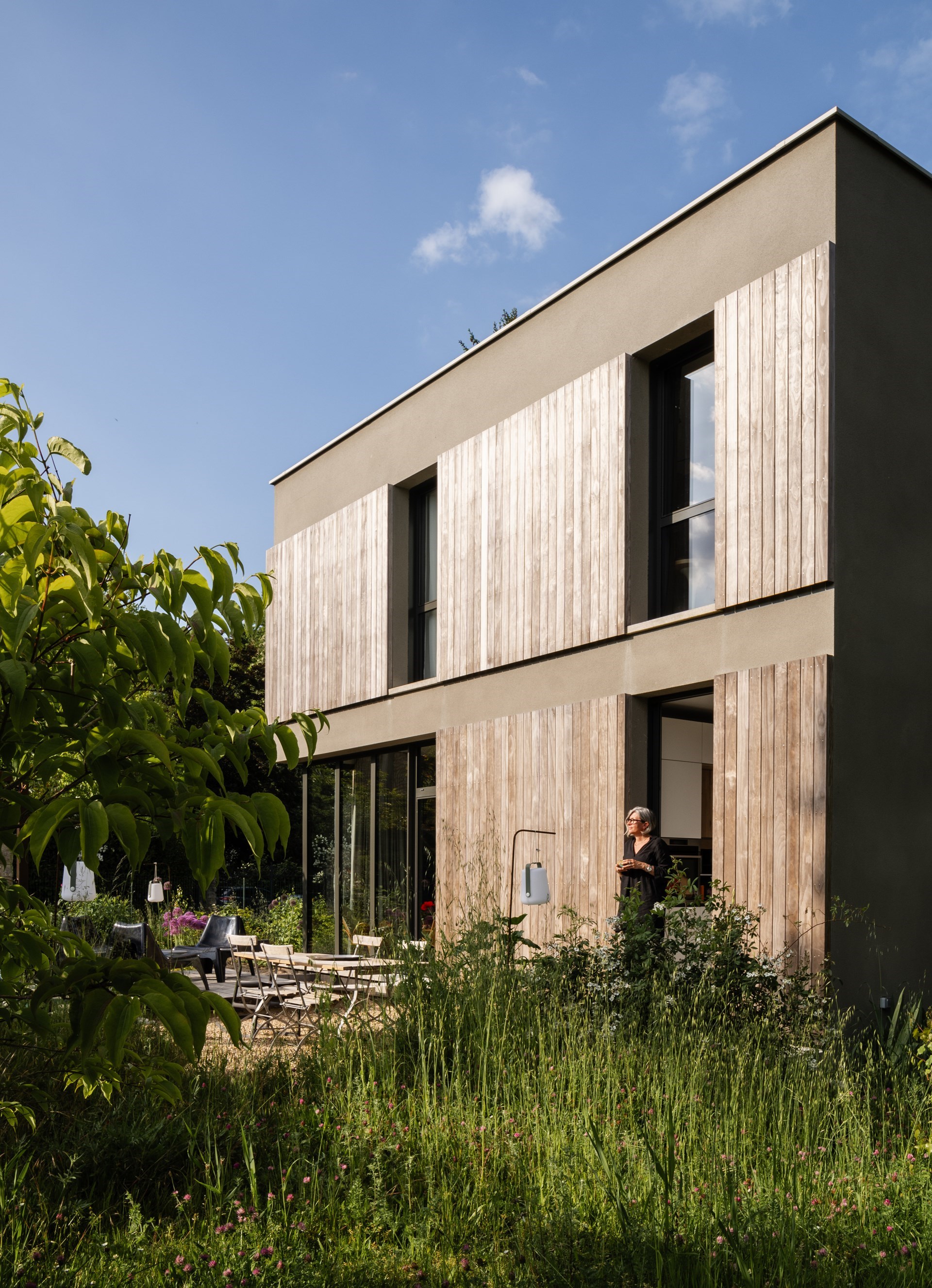 Het hout werd ook gebruikt voor de vlonders aan de buitenkant van het huis en komt ook uitgebreid terug in het interieur, waaronder de trap en de keuken. Deze continuïteit van het materiaalgebruik in de verschillende ruimten van het huis weerspiegelt de esthetische gevoeligheid van de huiseigenaren. In combinatie met de aangelegde, met bomen omzoomde tuin waarin het huis staat, geeft dit een gevoel van harmonie aan het ontwerp en levert het een ingetogen maar intieme woning op.